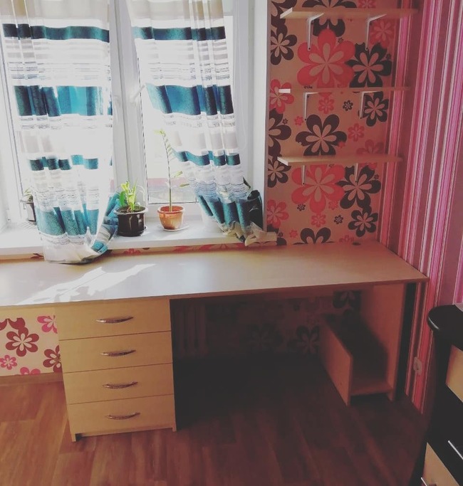 Удобная широкая столешница, шкафчики для хранения, книжные полки.