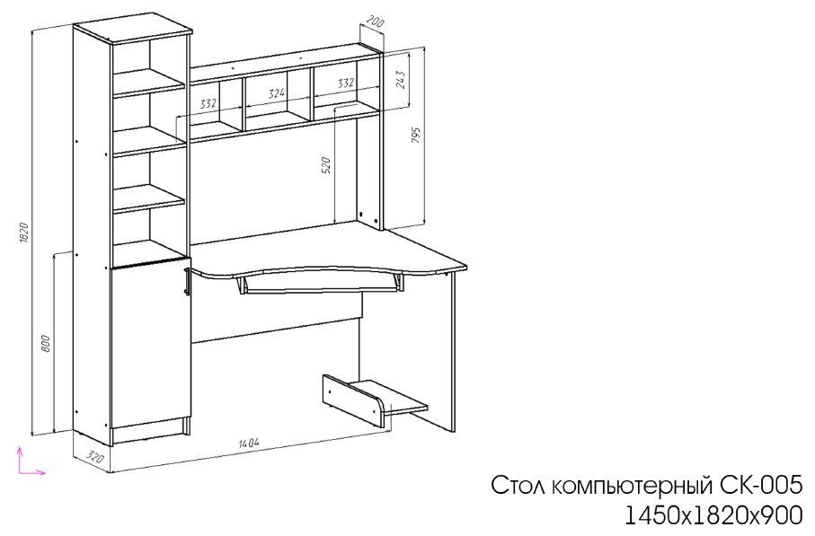 Угловой стол «СК-005» удобен в работе за компьютером и присоблен для размещения и хранения вещей, имеет нишу для системного блока, выдвижную полку для клавиатуры, а также закрытую тумбочку и большое количество вместительных полок.
