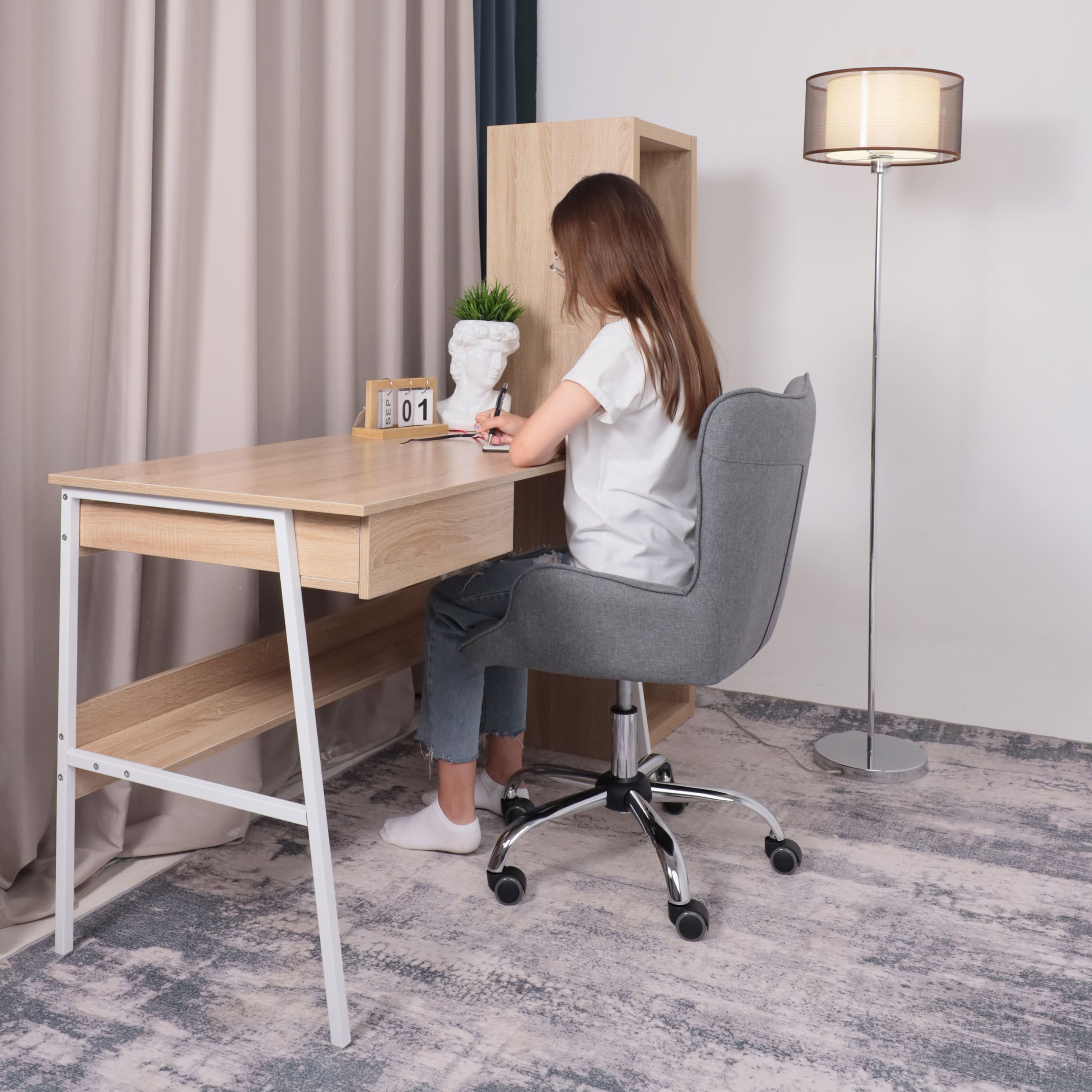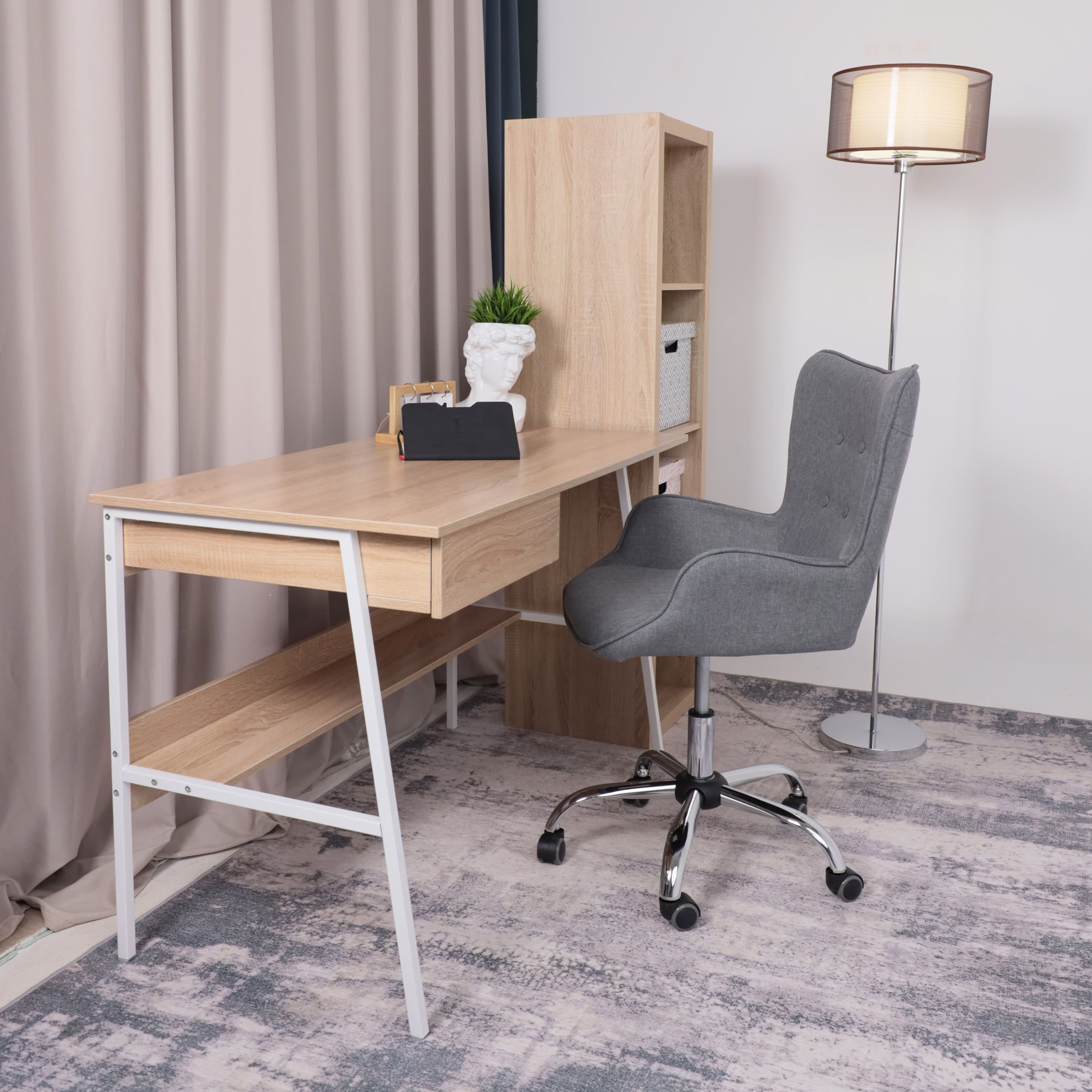 Выполнен в белом цвете, оснащен тумбой с выдвижными ящиками. Дополняется навесными полками.