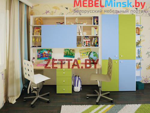 Модульная система для детской включает в себя четыре элемента. В состав модуля входят: письменный стол на металлических ножках с тумбой, шкаф и надставка с открытыми нишами и закрытой полкой. Цвет набора – салатовый и голубой в белом корпусе, столешница под дерева. Конструкция модуля изготовлена из ламинированного ДСП.
