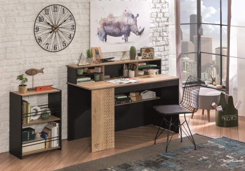 Тумба с выдвижными ящиками, ниши для хранения, надстройка с книжными полками.