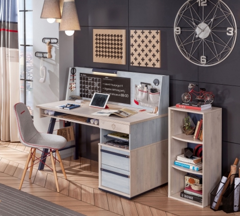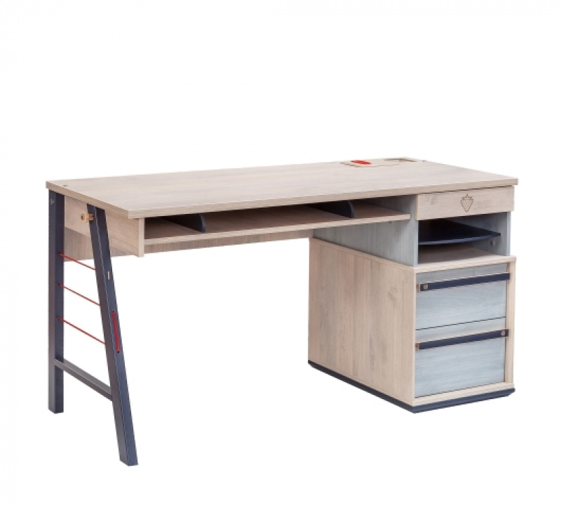 Стол оснащен двумя тумба с выдвижными ящиками и надстройкой в виде стеллажа.