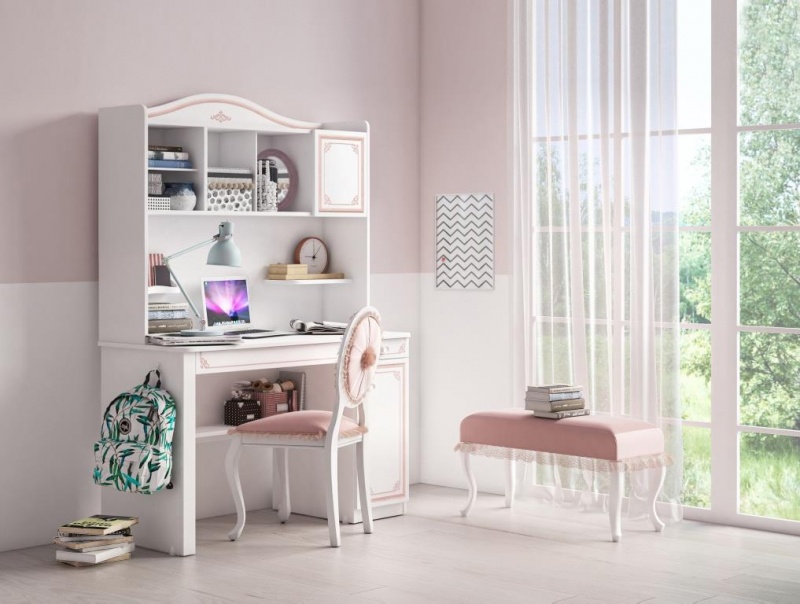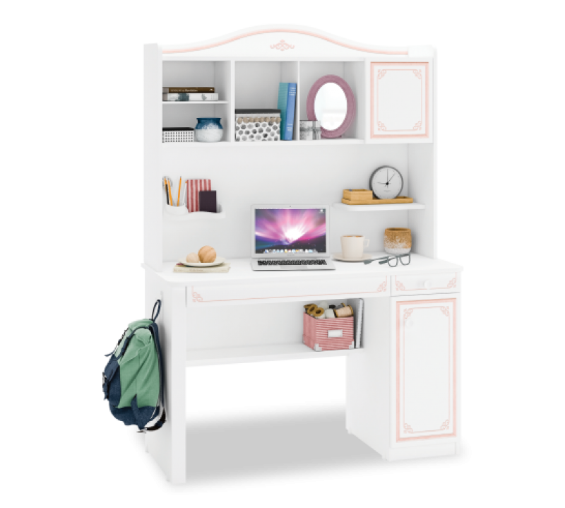 Широкая столешница, тумбы с выдвижными ящиками, шкафчик с полками.