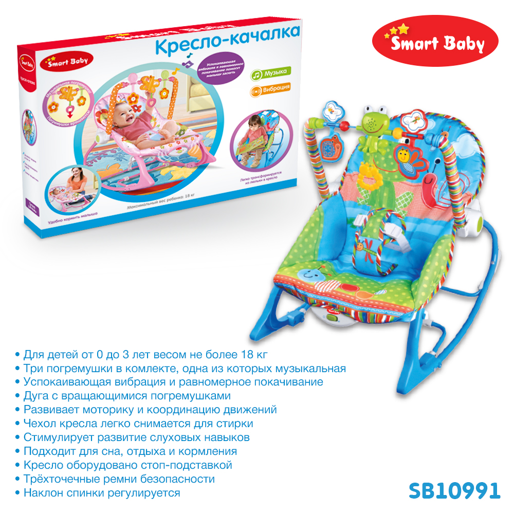 Шезлонг с виброблоком Smart Baby «Лягушонок» представлен в ярком и креативном дизайне, поэтому он отлично впишется в интерьер детской комнаты. На верхней дуге есть несколько игрушек, одна из которых с музыкальным сопровождением. Модель оснащена современным механизмом вибрации и покачивания, помогающие малышу заснуть. Во избежания случайного выпадения малыша из шезлонга, он оборудован трехточечными ремнями безопасности. Ортопедическая спинка обеспечивает правильное положение во время сна и игры.