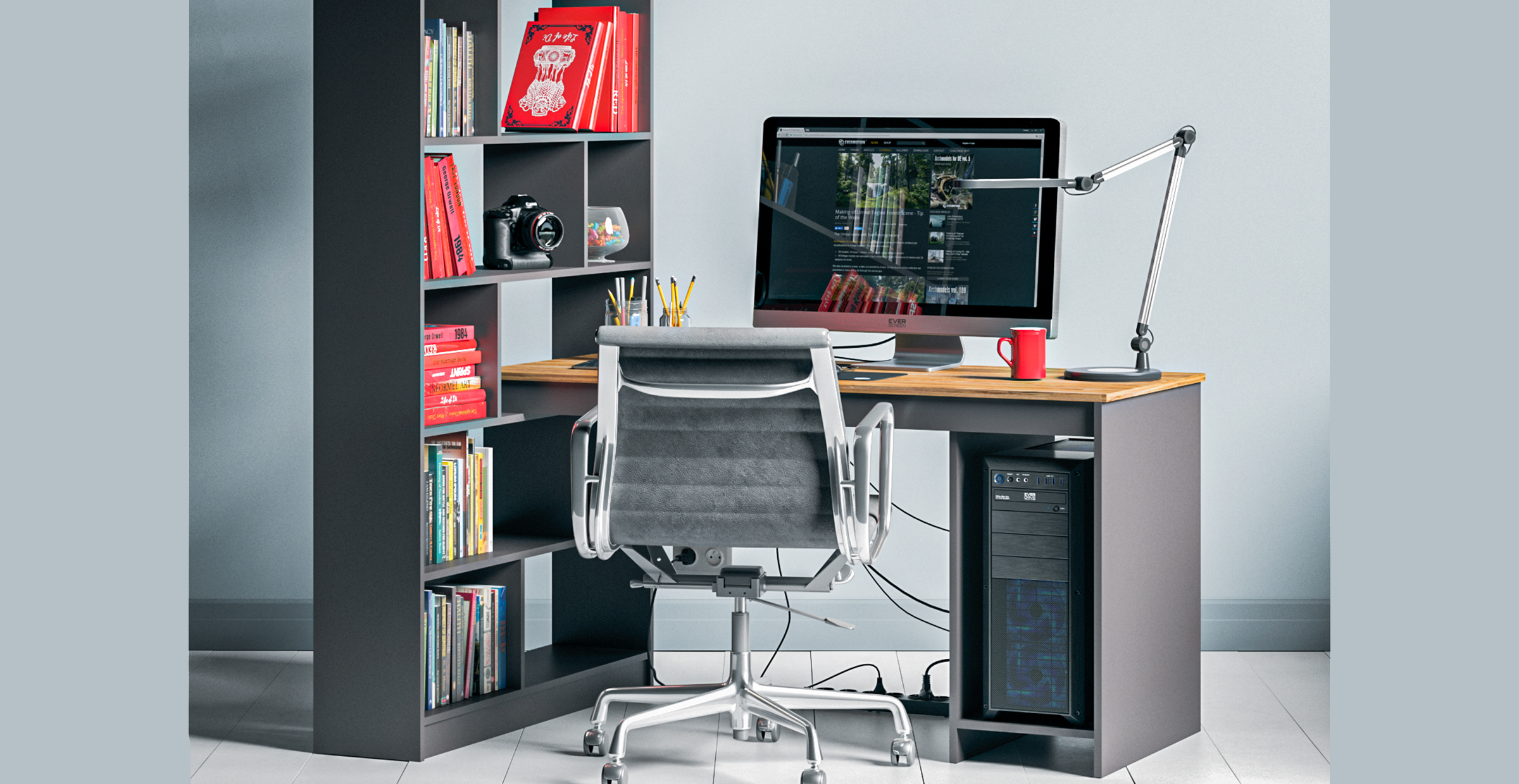 Стол оснащен выдвижными ящиками и дополняется навесными полками.