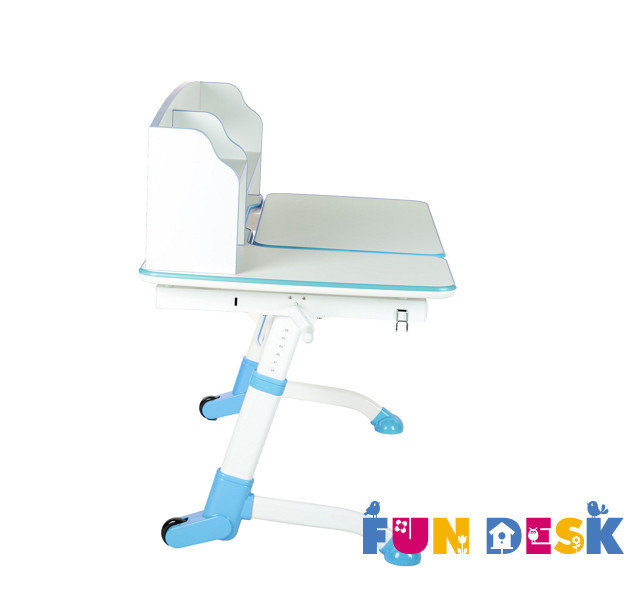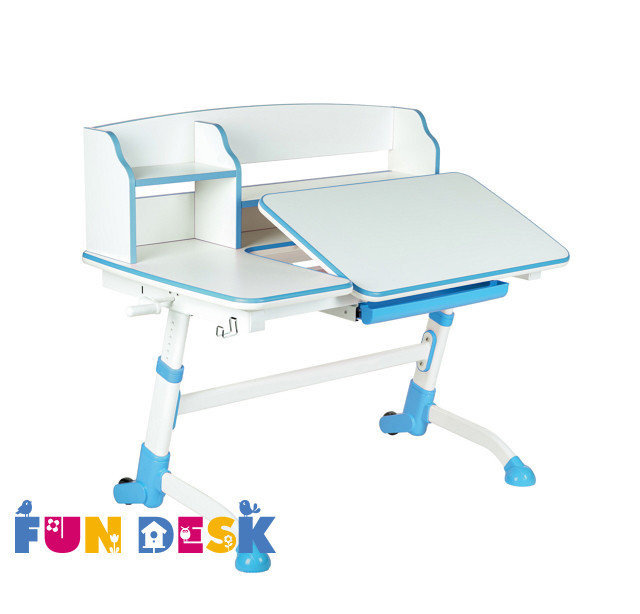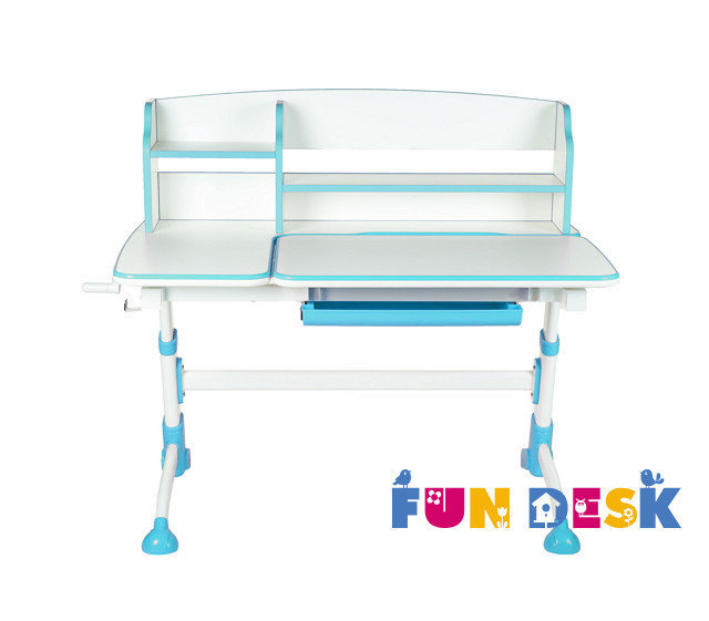 Яркий стол-парта «Fun Desk Amare II Blue» оформлен в белый цвет с обрамлением голубыми полосами. Устойчивые ножки помогут парте быть устойчивой, а колесики позволят не царапать пол при ее перемещении. В конструкции модели предусмотрена регулировка высоты стола и возможность сделать из столешницы большую подставку для большего удобства.