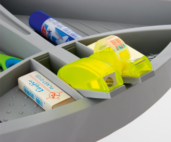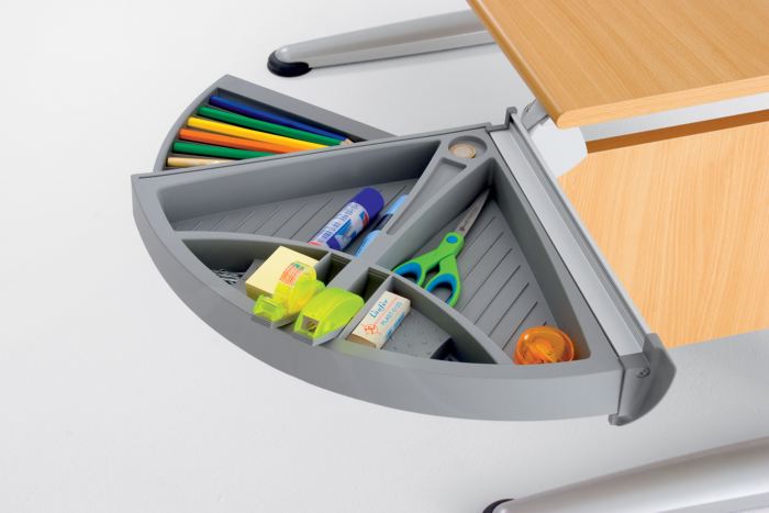 - Встроенный пенал Orga-Tool (только правый монтаж) для канцелярских принадлежностей со встроенными точилкой и скотчем;