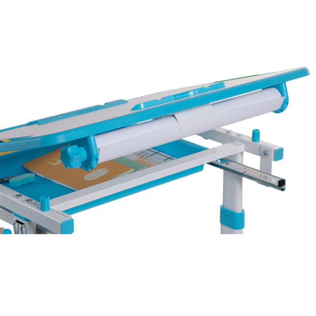 Стол оснащен двумя тумба с выдвижными ящиками и надстройкой в виде стеллажа.