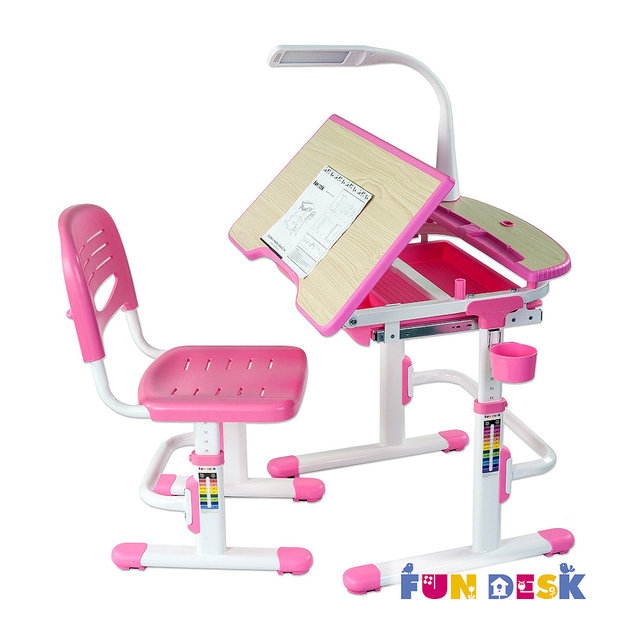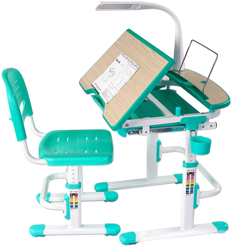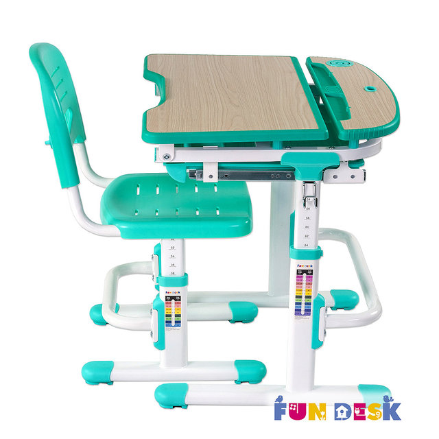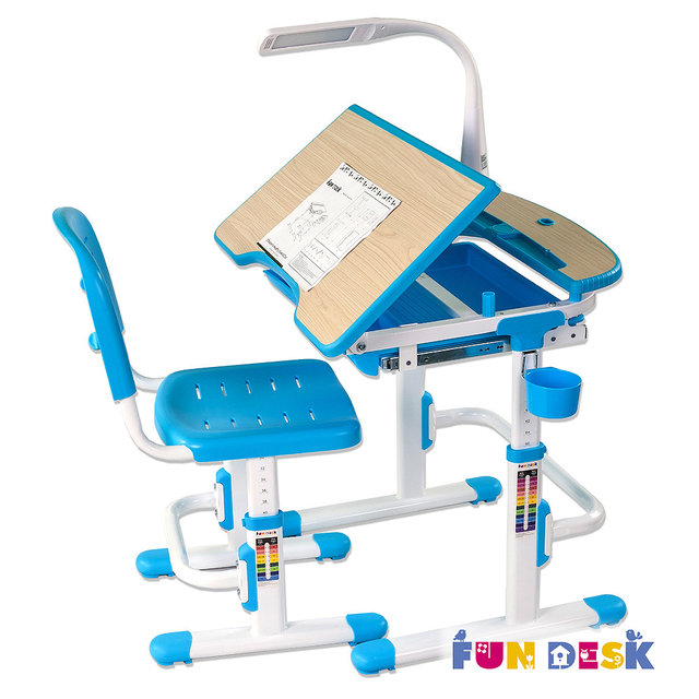 Стол-парта «Fun Desk Sorriso Blue» изготовлена из прочного и качественного МДФ с использованием металла и пластика в конструкции стола. В комплекте со столом идет стул с прорезями для вентиляции. Комплект оформляется в разнообразных оттенках цвета, придающих ему стильный вид. Столешница поднимается вверх и превращается в просторную подставку.