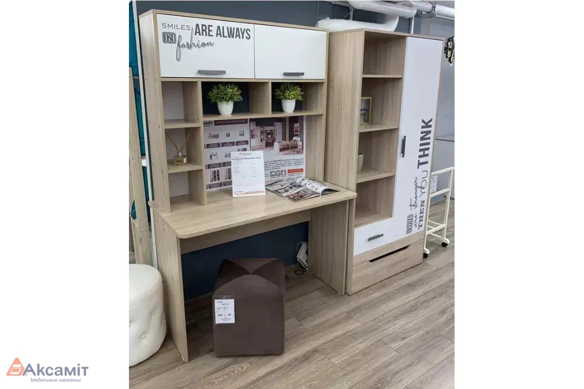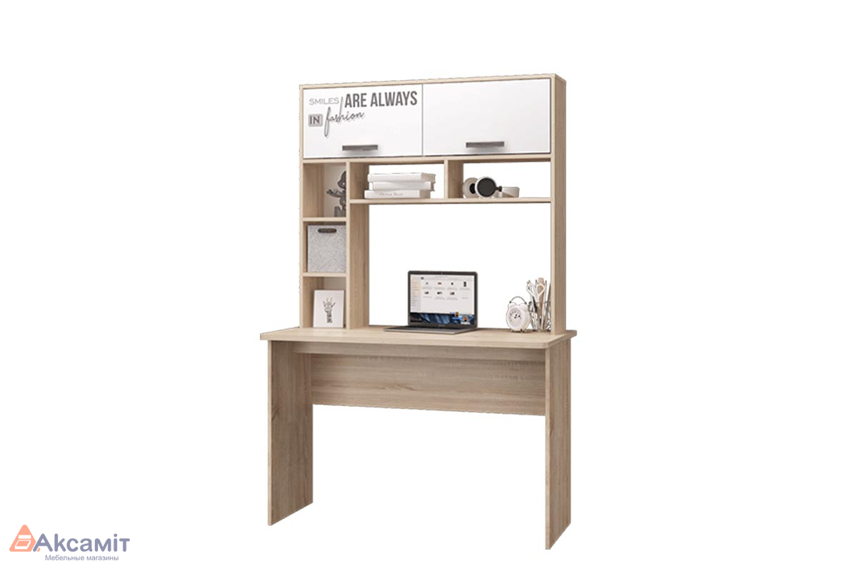 Стол оснащен выдвижными ящиками и дополняется навесными полками.
