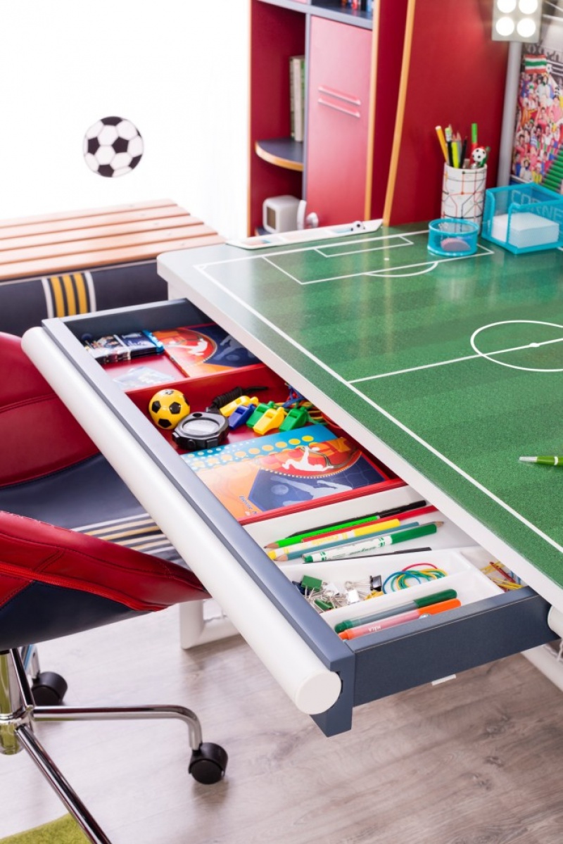 Стол оснащен шкафчиками, стеллажами и выдвижными ящиками.