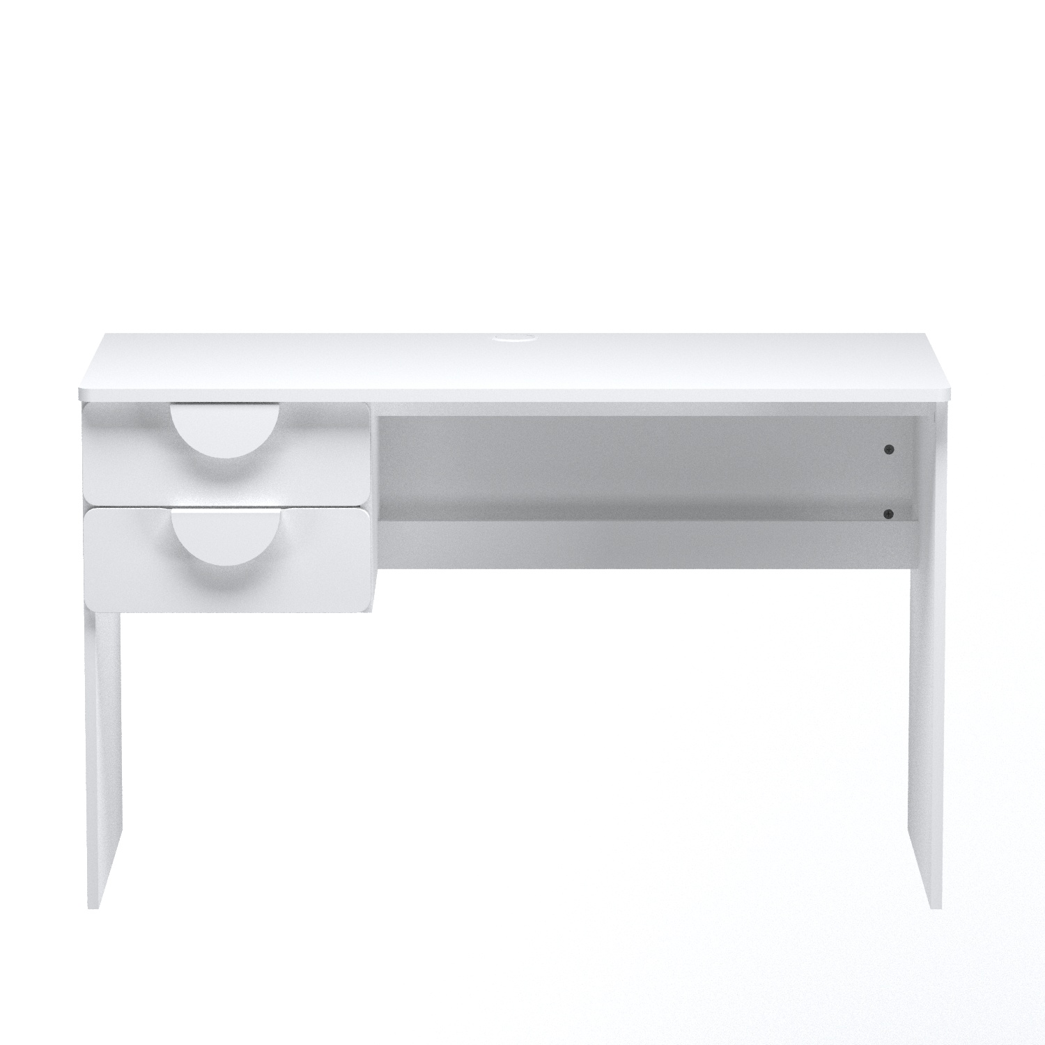 Выполнен в белом цвете, оснащен тумбой с выдвижными ящиками. Дополняется навесными полками.