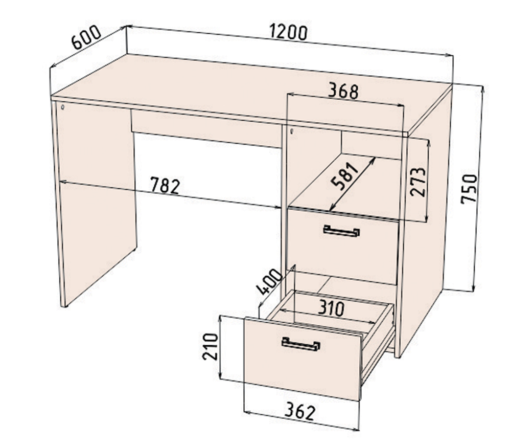 Стол оснащен двумя тумбами с выдвижными ящиками. Стеллажи с открытыми и закрытым полками.
