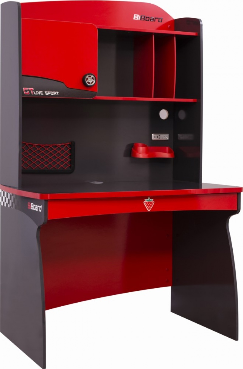 Стол оснащен шкафчиками, стеллажами и выдвижными ящиками.