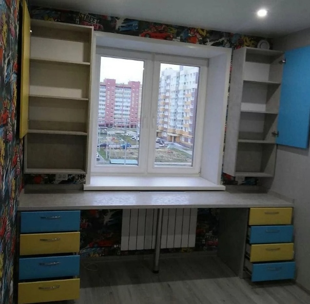 Тумбы с ящиками для хранения, навесные модули с нишами, удобная столешница.