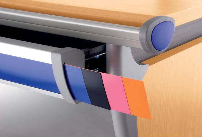 У передней кромки стола находится удобный лоток для ручек и карандашей и встроенная линейка, которая одновременно является ограничителем для скользящих по столешнице предметов.