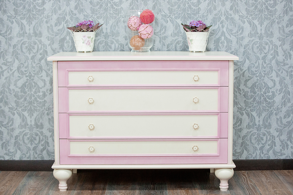 Широкий комод на четыре вместительных выдвижных ящика в белом корпусе из натурального дерева с цветной отделкой и патиной на маленьких ручках. Крышка и основание с закругленными углами кромки. Фигурные ножки с лицевой стороны в классической фрезеровке.