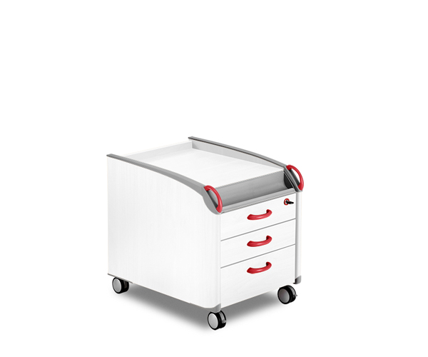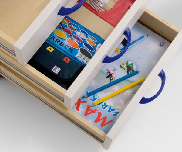 Верхний ящик закрывается на ключ, что безусловно понравится вашему ребенку. Верхняя полка оборудована ограничителями для безопасной установки техники (защита от падения). В то же время, в комплекте с подушкой "Pad M" тумба может быть использована в качестве пуфа. Из четырех оттенков каркаса и шести расцветок ручек вы сможете скомпоновать свой индивидуальный продукт.