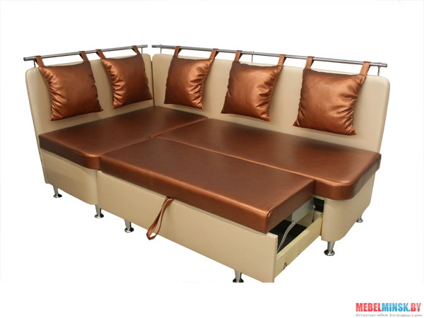 Цветовая гамма в данном варианте выполнена в комбинированном цвете: бежевый корпус и коричневое сидение с подушками, которые имеют привлекательный легкий блеск, придающий модели некоторой торжественности и величия. Обивка выполняется из винилискожи Origon или ткани Elegance, Malta итальянского производства и характеризуется высоким качеством и хорошей износостойкостью.