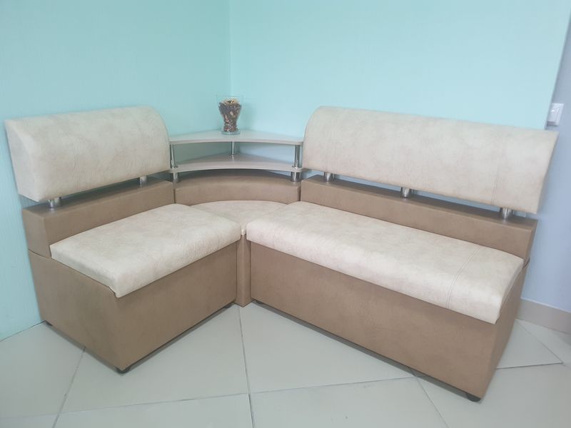В набор входит: угловая скамья, стол, два табурета. Обивка: экокожа, ткань.