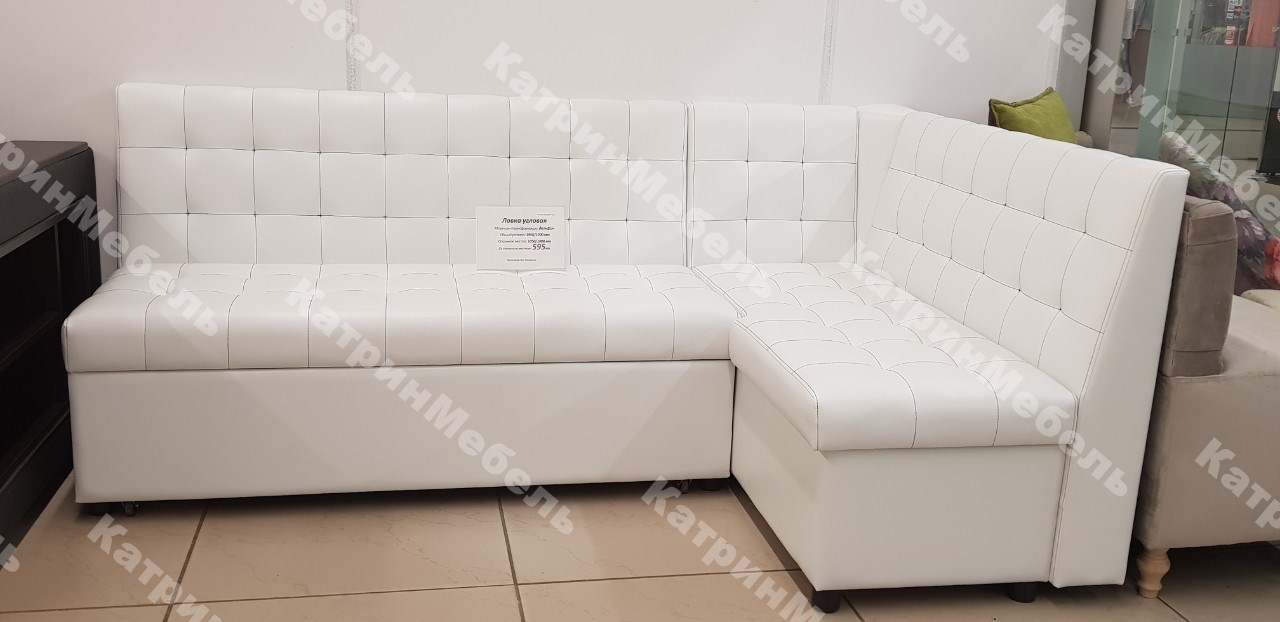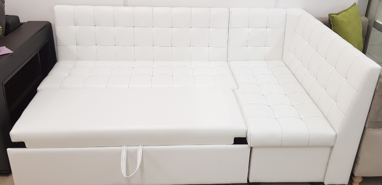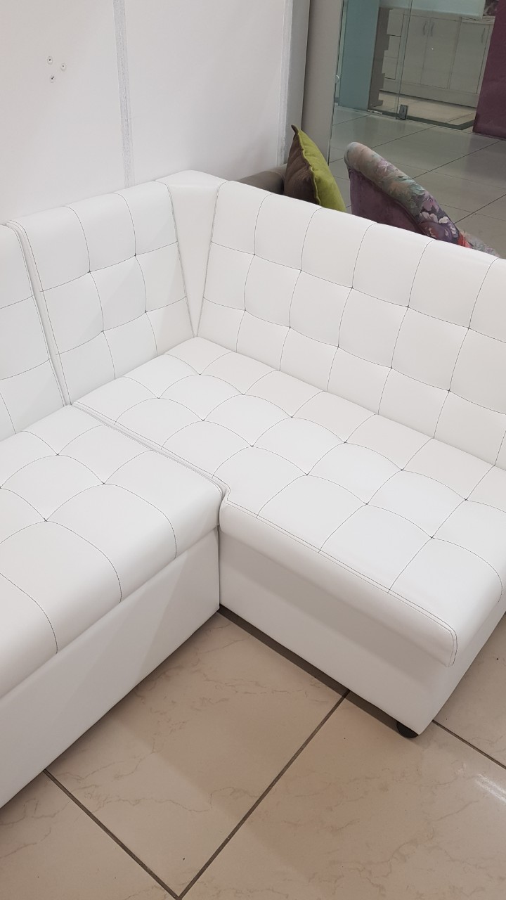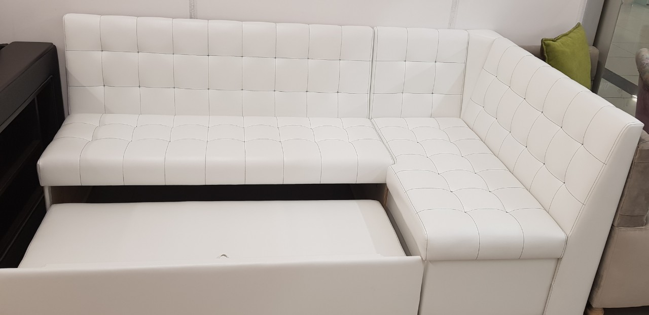 Угловая модель выполнена в универсальном белом цвете и декорирована стяжкой по всей поверхности спинки и сидения.
