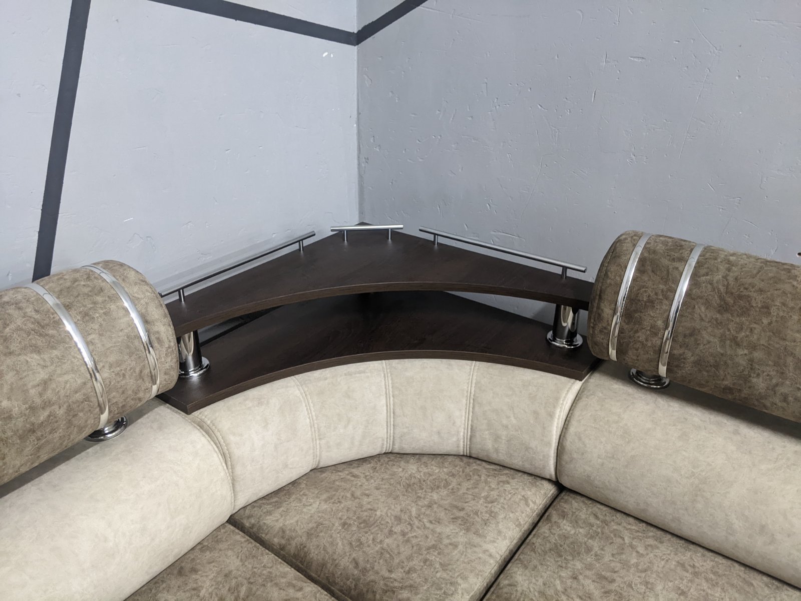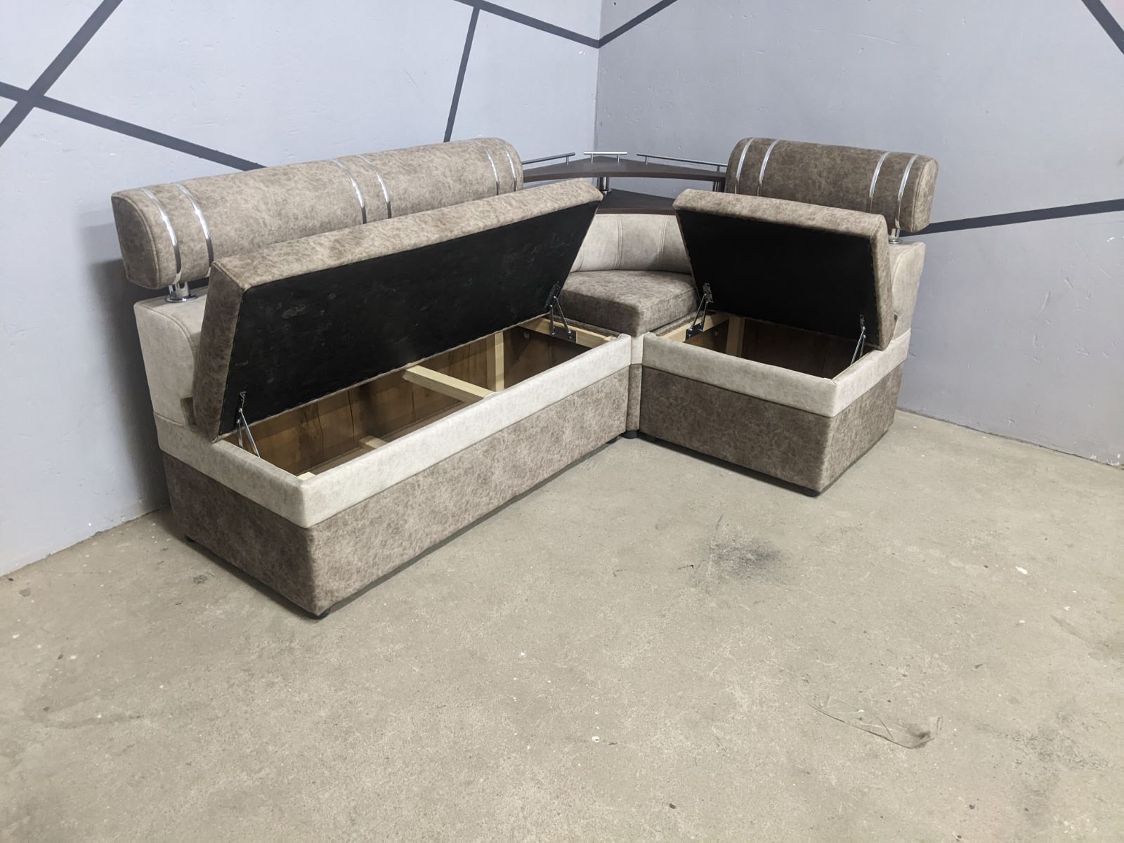 В набор входит: угловая скамья, стол, два табурета. Обивка: экокожа, ткань.