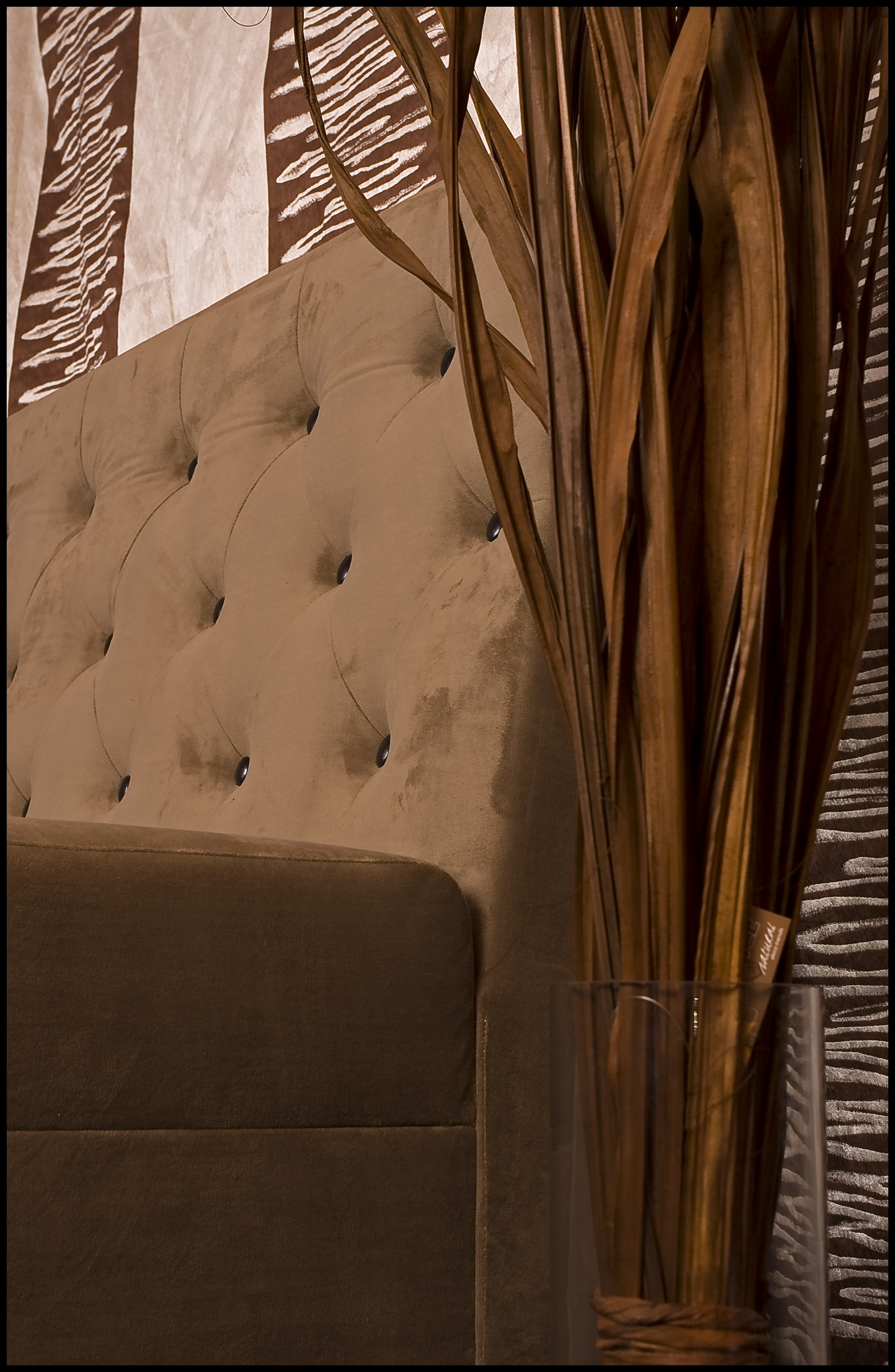 Элегантный диван с удобной простеганной спинкой без подлокотников на деревянных ножках. Обивка в светло-коричневом цвете микровелюра.