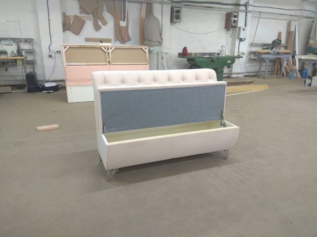 Оснащен вместительным ящиком для хранения. Мягкие подушки на спинке.
