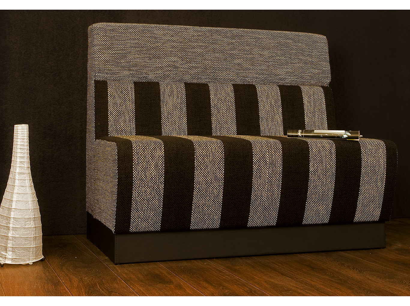 Стильный диванчик с закрытым осованием без механизма трансформации. Нейтральная по цвету тканевая обивка со вставкой в коричневую вертикальную полоску. Возможно изготовление по размерам заказчика.