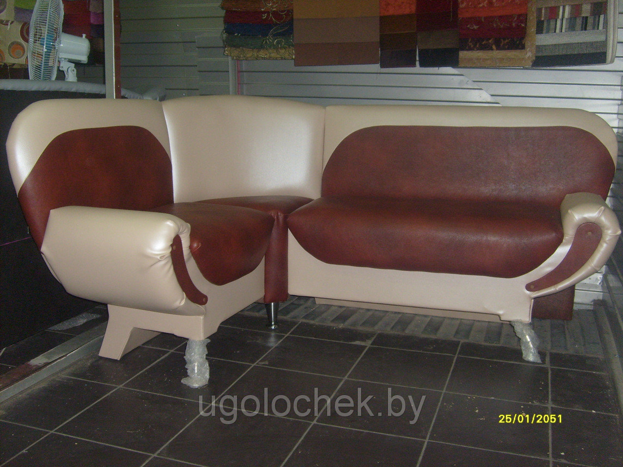 В набор входит: угловая скамья, стол, два табурета. Обивка: экокожа, ткань.