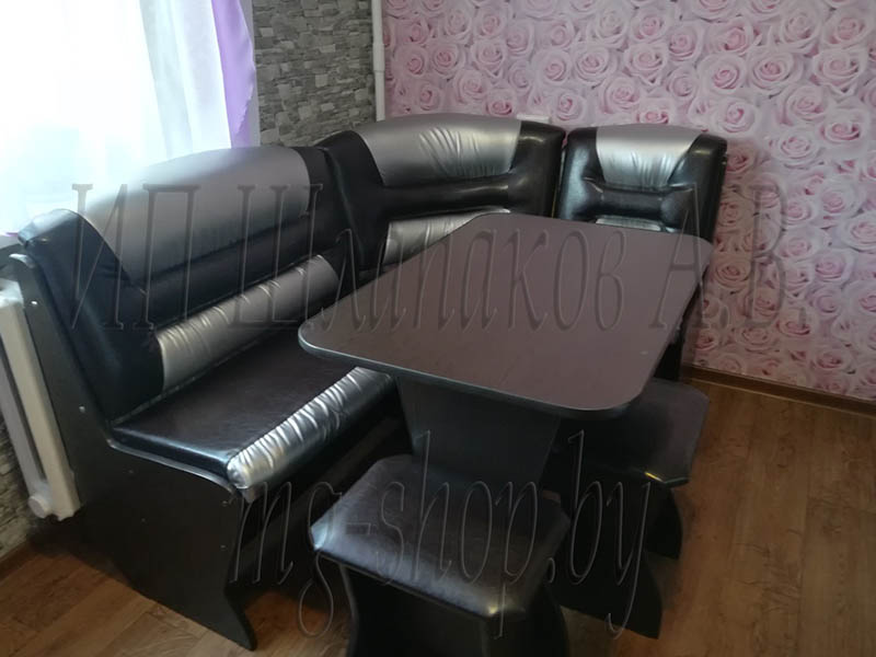 код 118512В набор входит: угловая скамья, стол, два табурета. Обивка: экокожа.