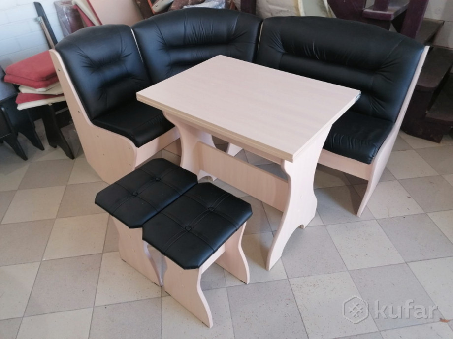 код 118513В набор входит: угловая скамья, стол, два табурета. Обивка: экокожа.