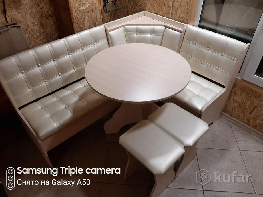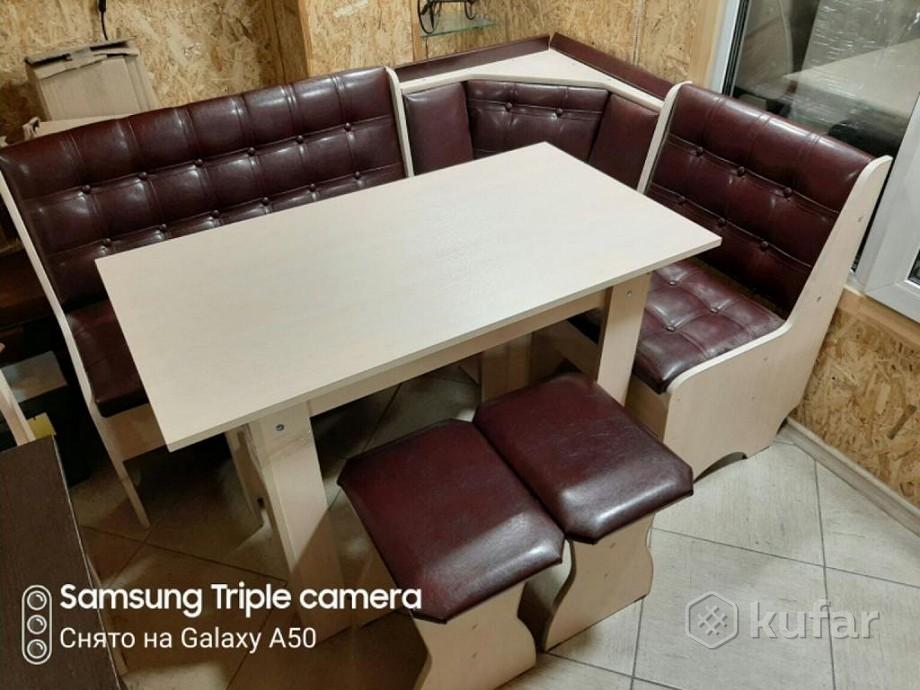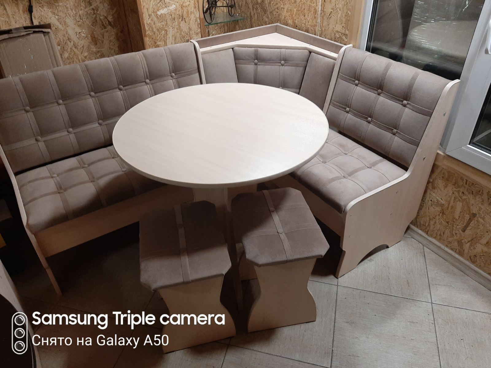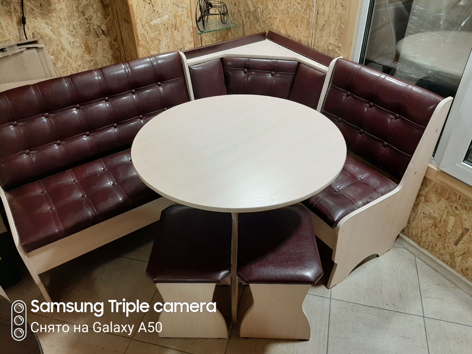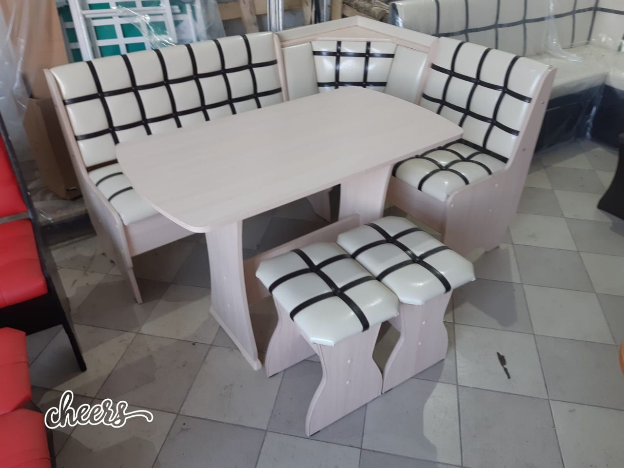 В набор входит: угловая скамья, стол, два табурета. Обивка: экокожа, ткань.