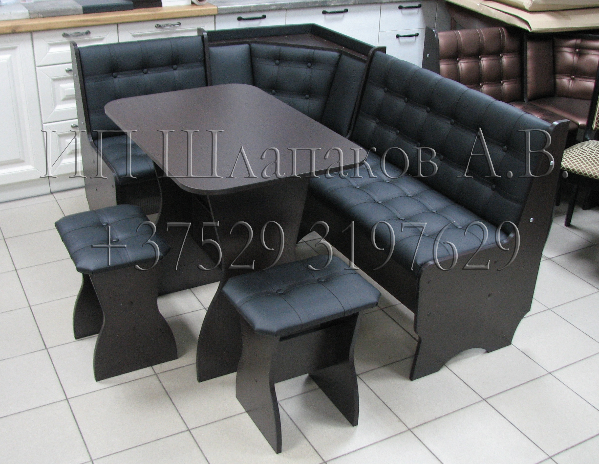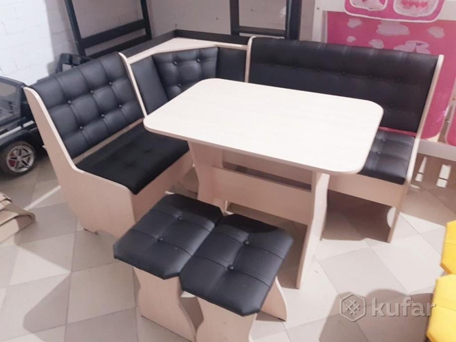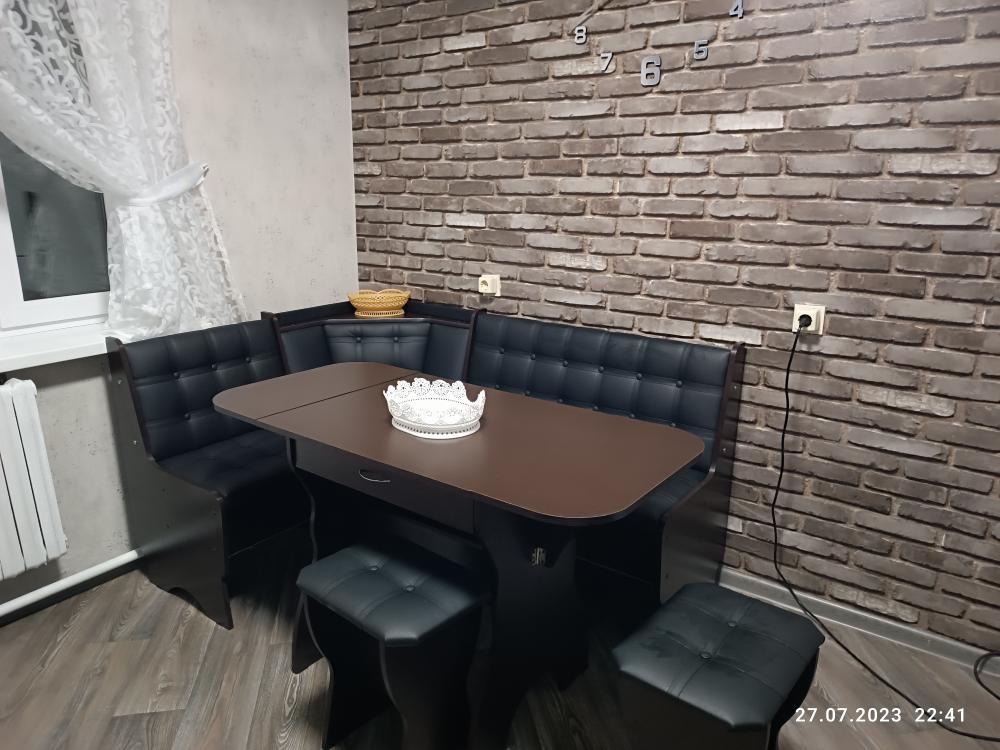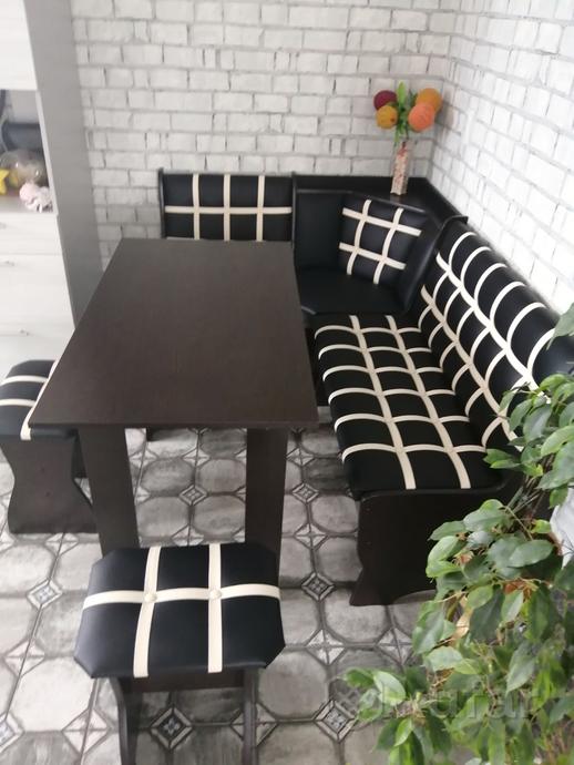 код 118510В набор входит: угловая скамья, стол, два табурета. Обивка: экокожа.