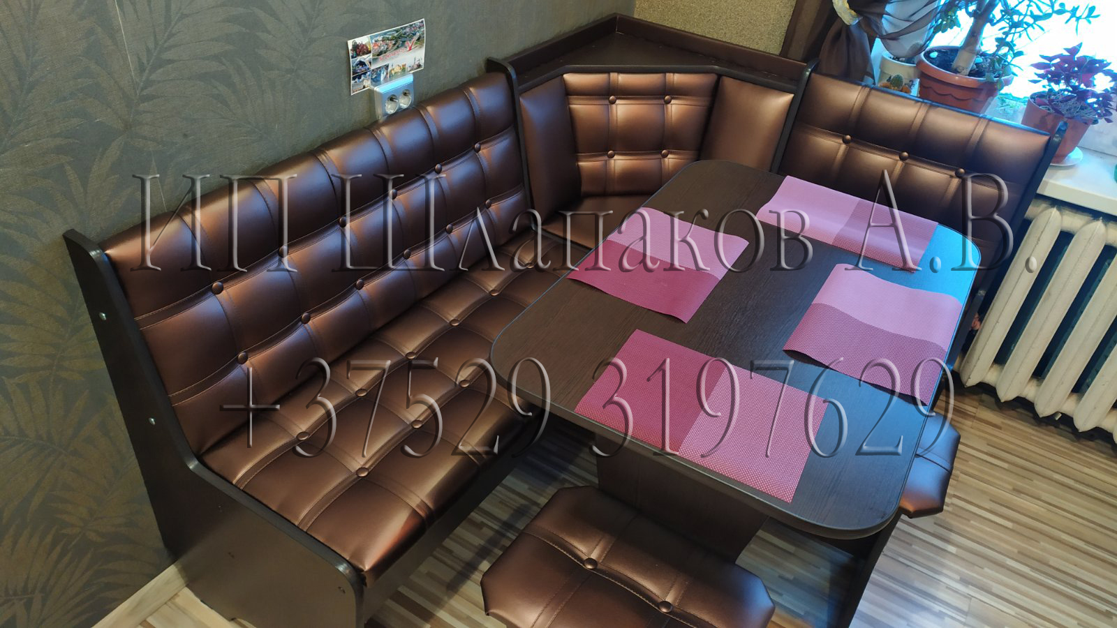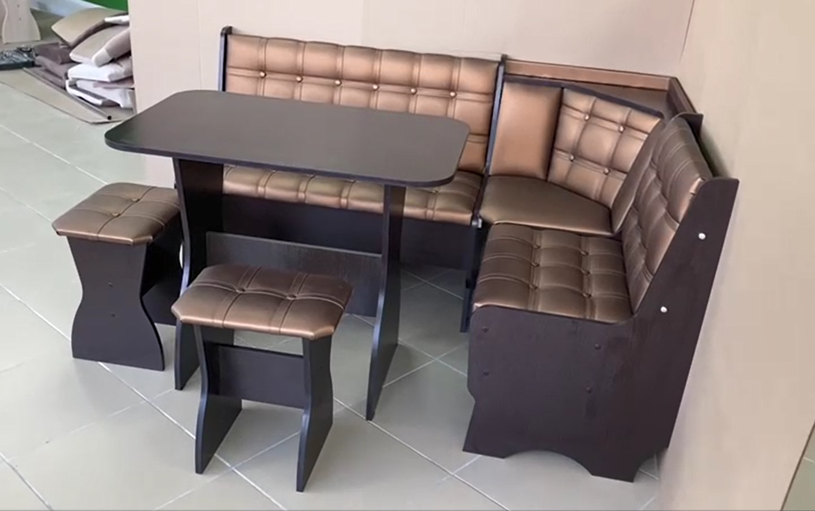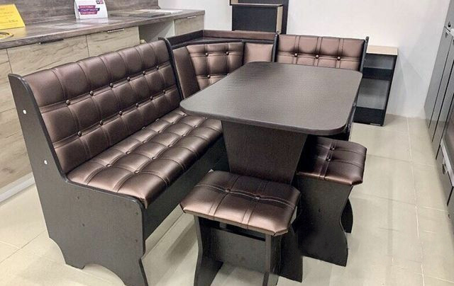 код 118277Кухонный уголок к шоколадном цвете. В набор входит: угловая скамья, стол, два табурета. Обивка: экокожа.