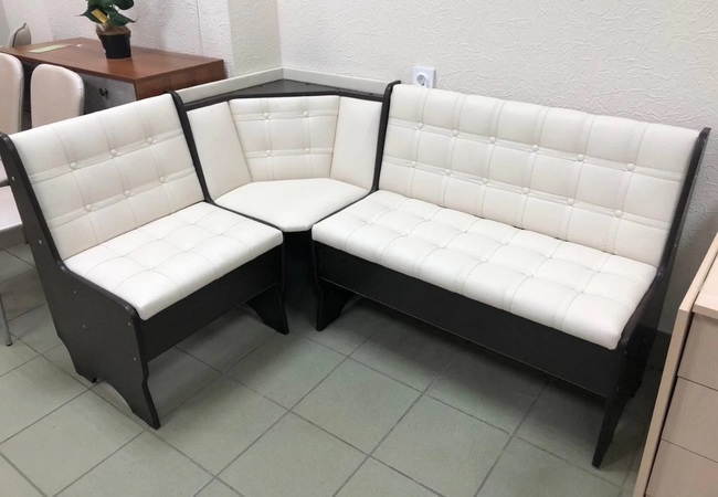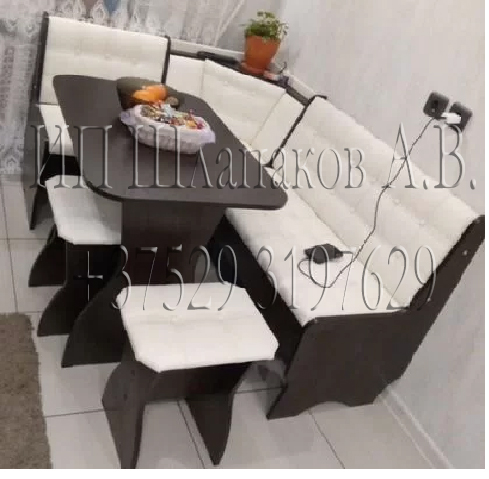В набор входит: угловая скамья, стол, два табурета. Обивка: экокожа,ткань. Мягкая спинка со стяжкой.