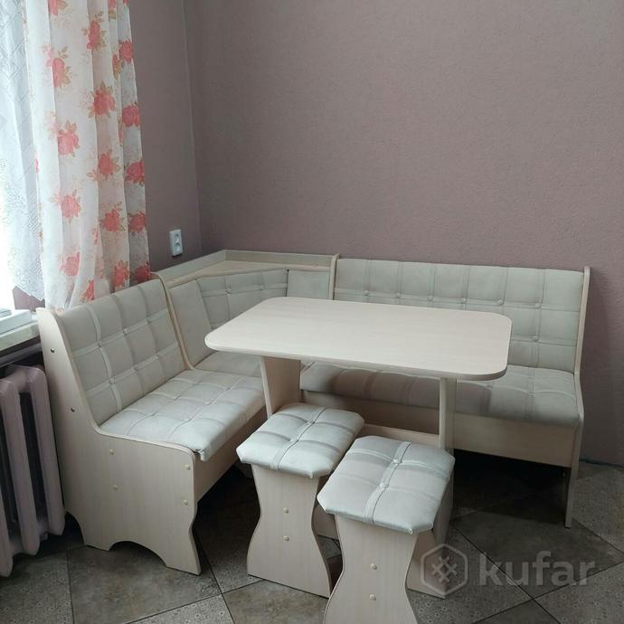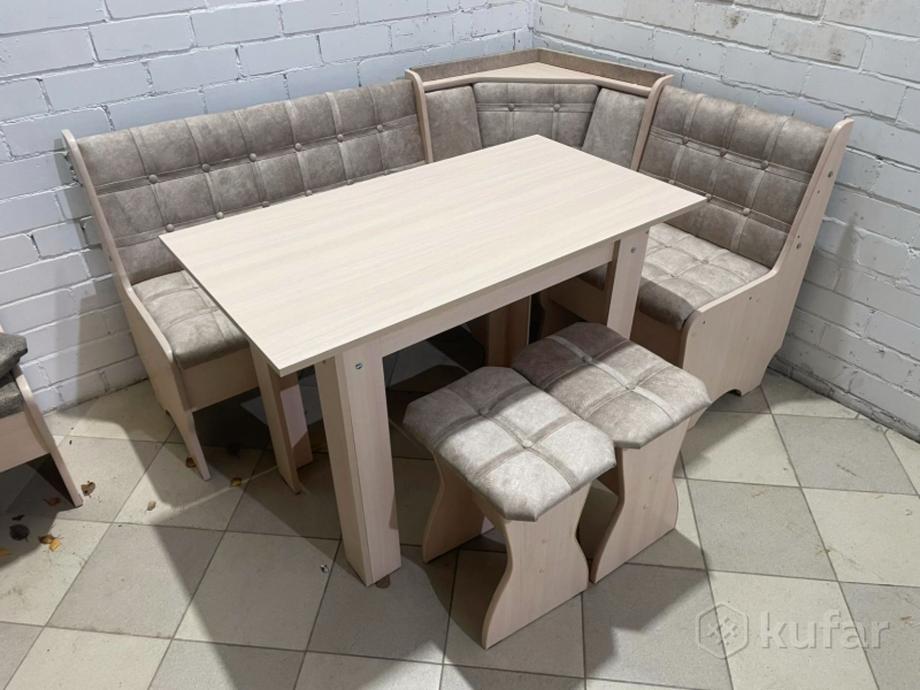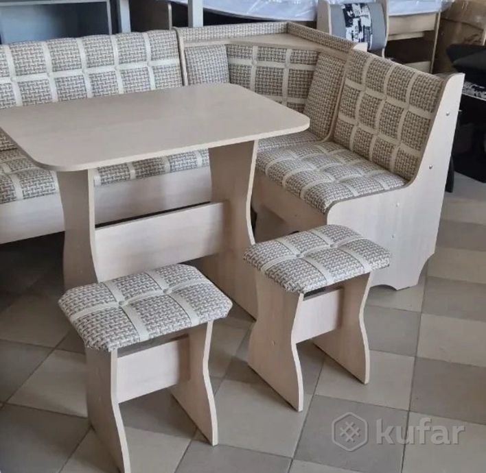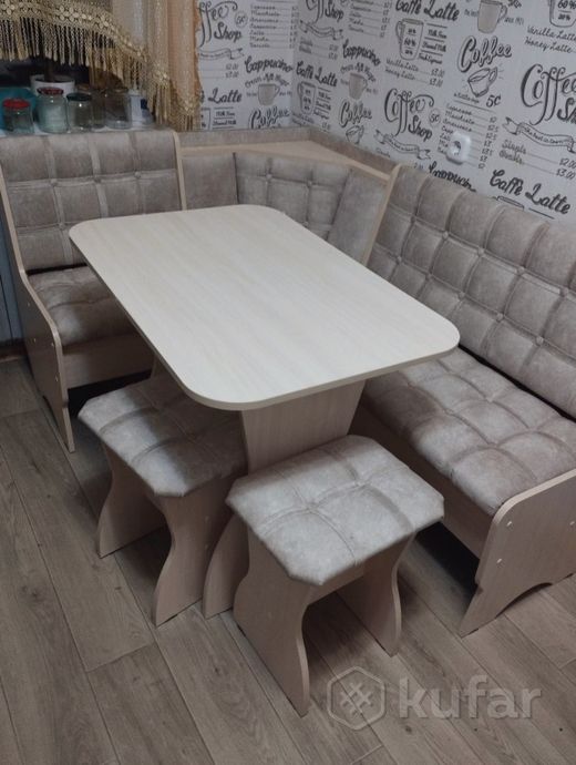 код 148447В набор входит: угловая скамья, стол, два табурета. Обивка: экокожа, ткань.