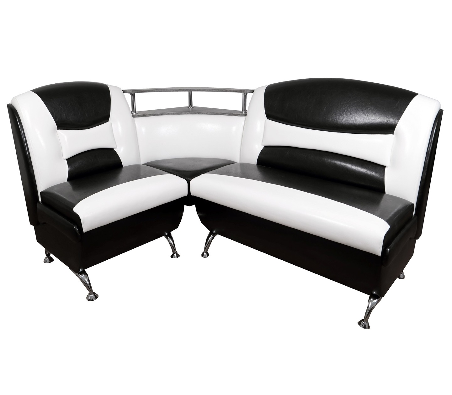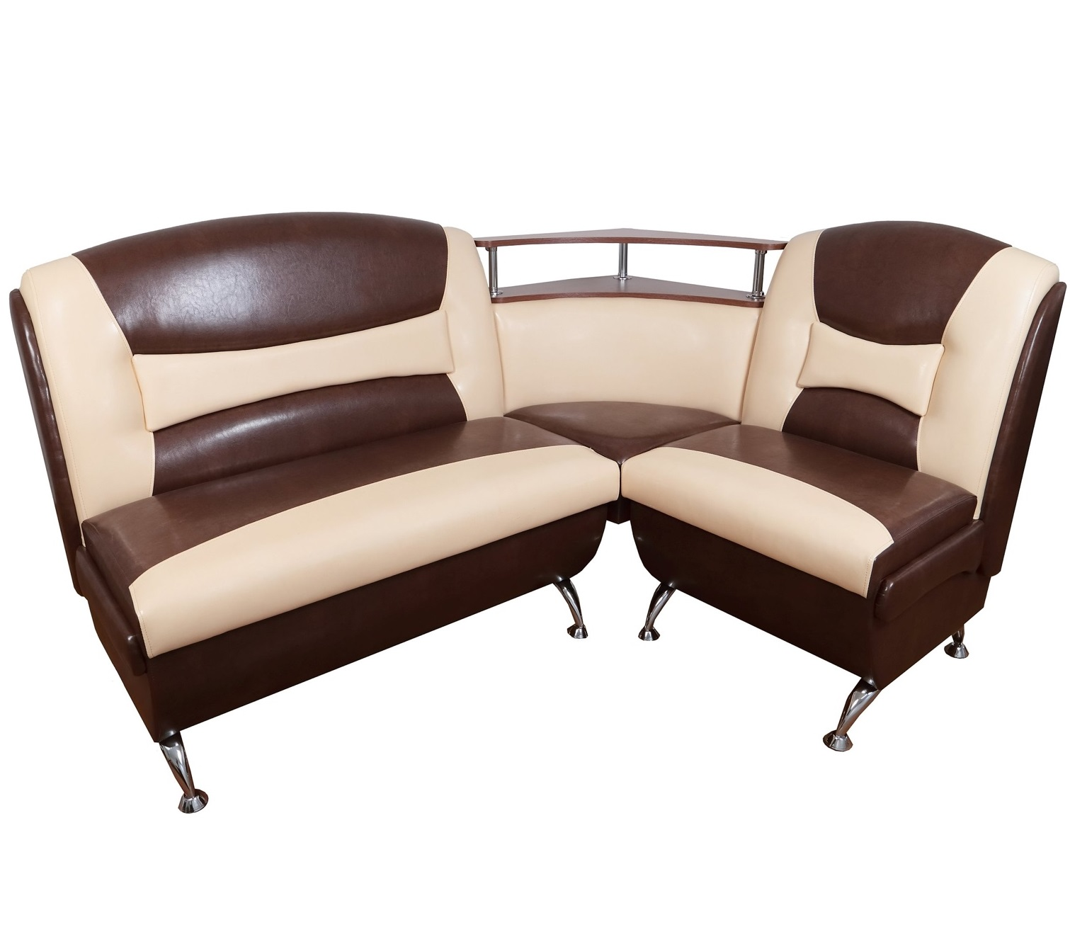 Изысканная угловая скамья «Француз» исполнена в сочетании коричневого и молочного цветов, идеально дополняющих друг друга. Конструкция оснащена угловой подставкой с двумя ярусами на хромированных стойках. В основании дивана имеется ниша для хранения вещей. На пол угловая скамья устанавливается при помощи прочных хромированных ножек.