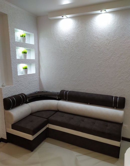 Кухонный уголок в современном стиле. Очень удобная изогнутая спинка, которая способствует комфортному и полноценному отдыху. Дополнительная отдельная полка с хромированными перильцами в стиле Ретро. Ниша для хранения. Универсальность угла.
