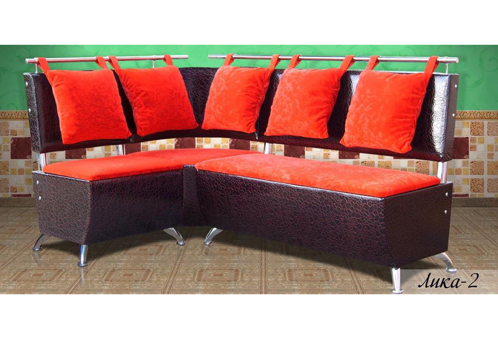 Материал корпуса кухонного уголка «Лика-2» имитирует кожу крокодила в приятном коричневом цвете с легким блеском. Обивка и декоративные подушки гарнитура исполнены в ярко-красном цвете. Основанием конструкции служит ряд хромированных металлических ножек с элегантной изогнутой формой и пластиковыми заглушками для предотвращения царапин на полу.