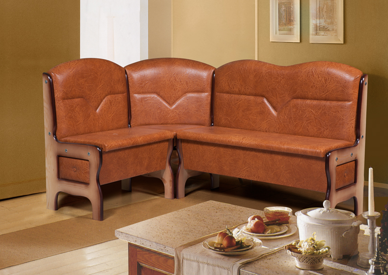 Кухонный уголок «Лотос» выполнен из кожзама коричневого цвета. Угловая модель удобна для размещения вместе с обеденным столом на небольшой кухне. Обивка дивана украшена глубокой фактурой, а спинка имеет элегантные изгибы. Обивка на выбор: кожзаменитель различного цвета или ткань мебельная.