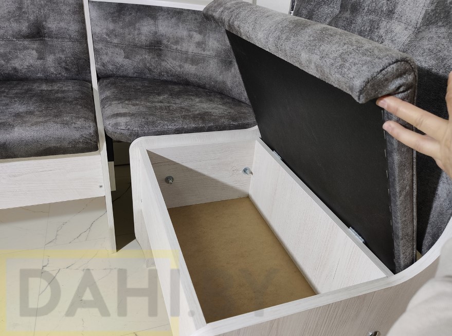 Кухонный уголок Магнат с полкой выполнен из ЛДСП высокого качетства (сосна каньон), стандартный размер 120х170 см (возможно изготовление во вашим размерам). Под сидениями расположены просторные ниши для хранения, в угловой части имеется полочка.