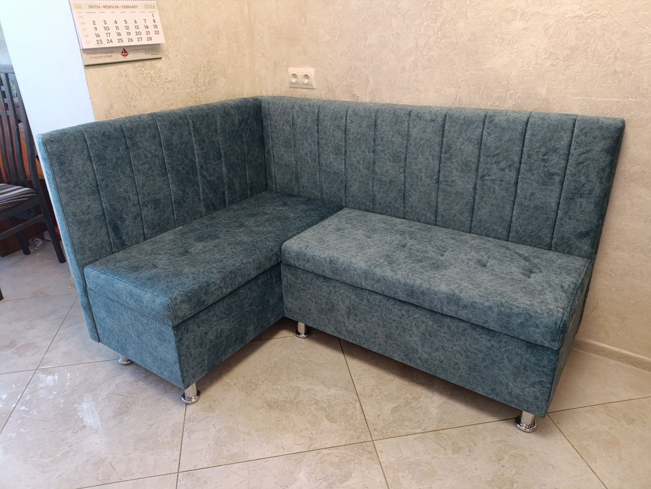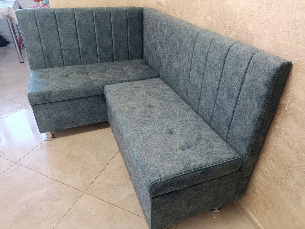 Мягкий кухонный уголок серого цвета на деревянных опорах. Габариты: 1200х1900х850 мм.