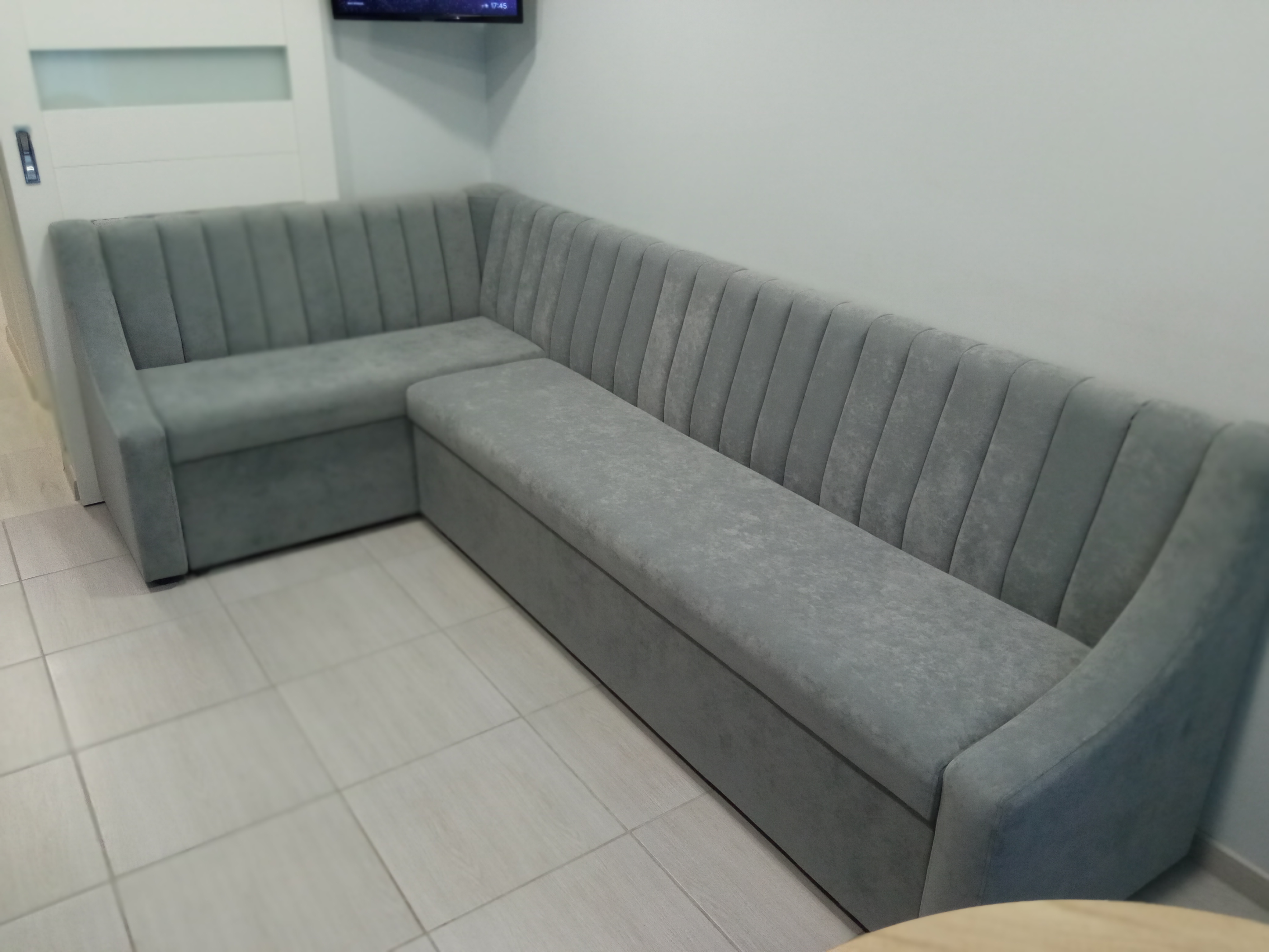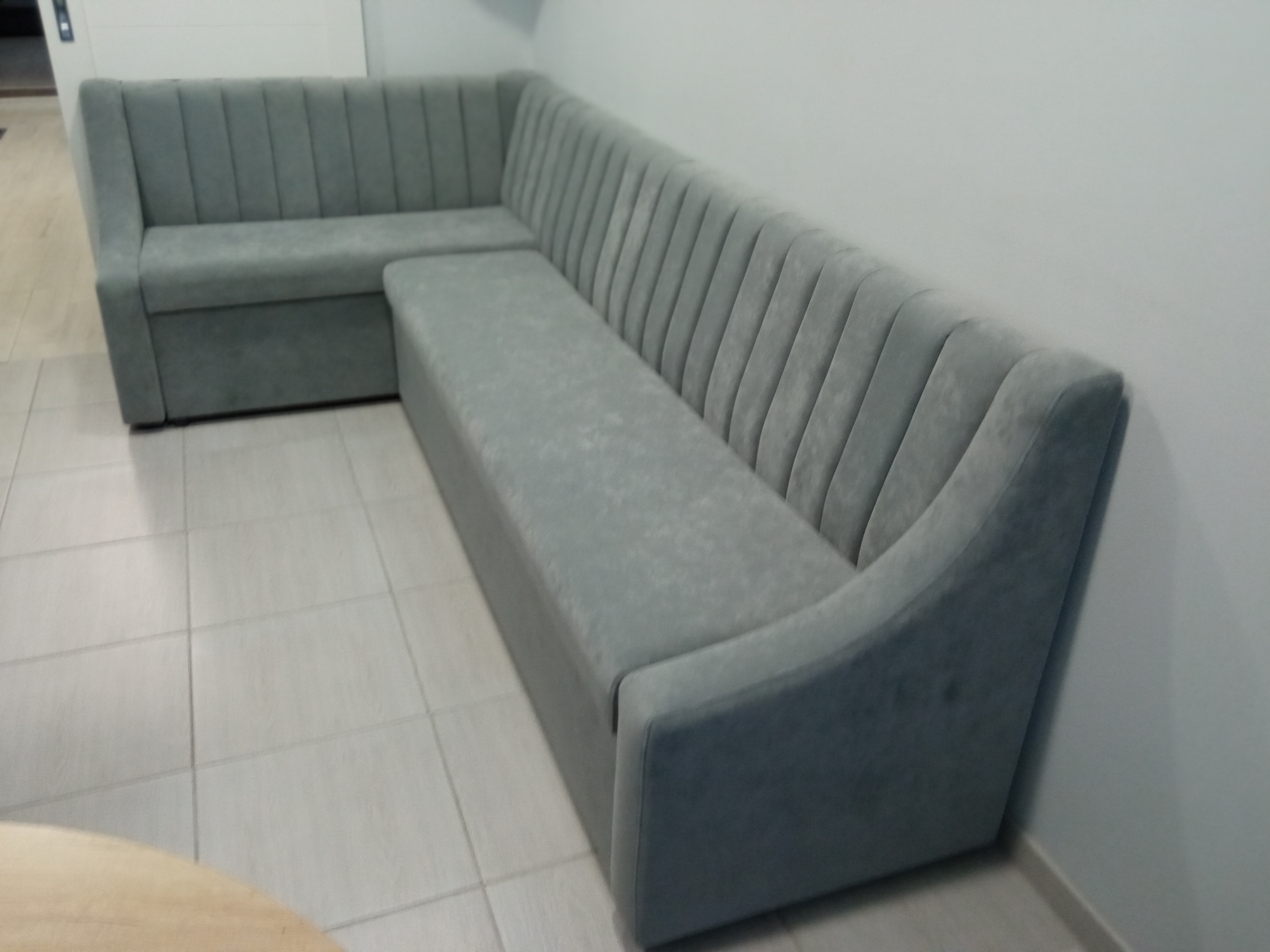 Угловой кухонный диван в серой обивке из микровелюра