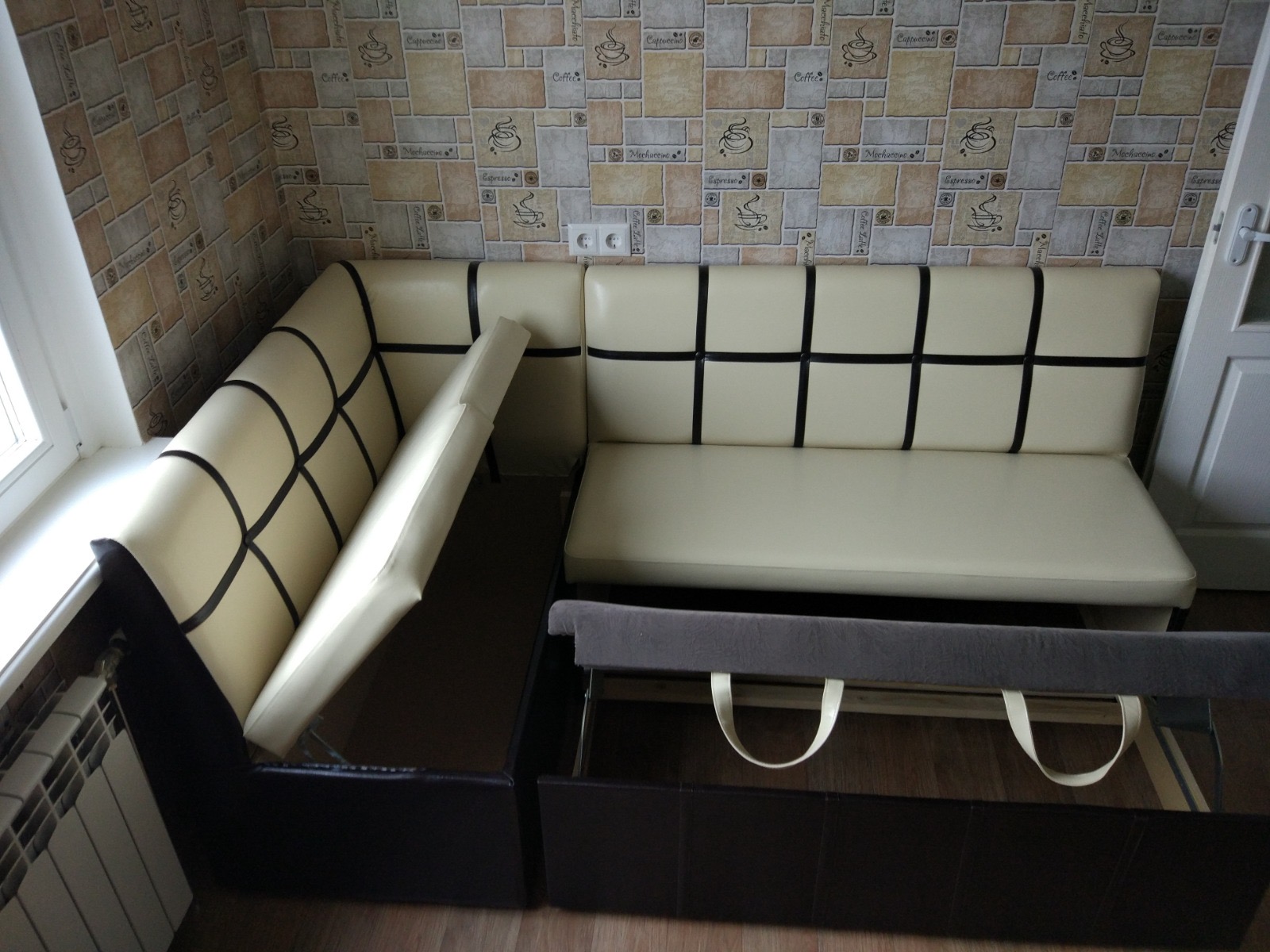 Угловой диван для кухни со спальным местом и нишей для хранения.
