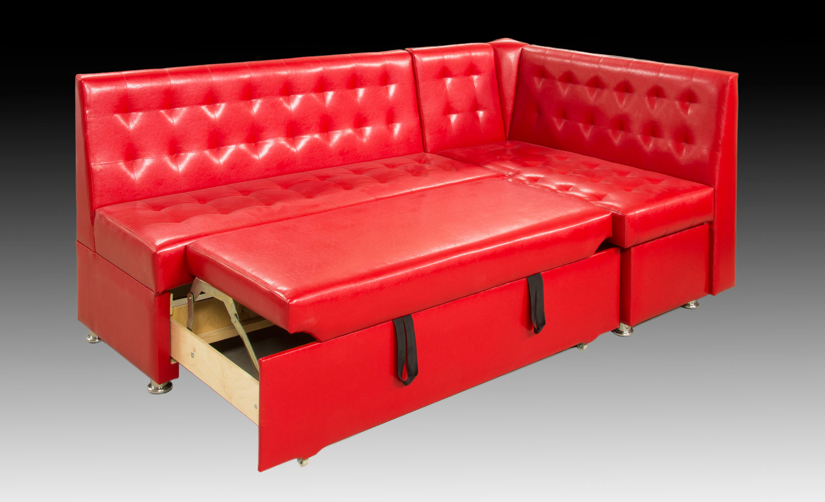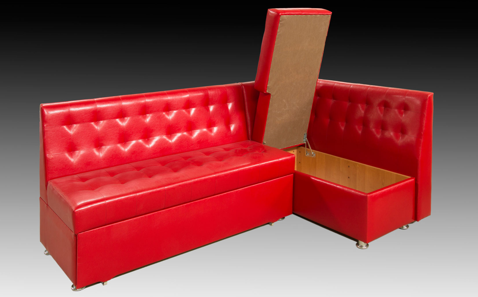 Угловой кухонный диван оснащен очень удобным спальным местом, которое будет наилучшим вариантом для неожиданных гостей. В качестве оббивки используется экокожа или кожзам в самой различной цветовой гамме, которая впишется именно в ваш интерьер. На сидении и спинке используется английская или каретная стяжка.