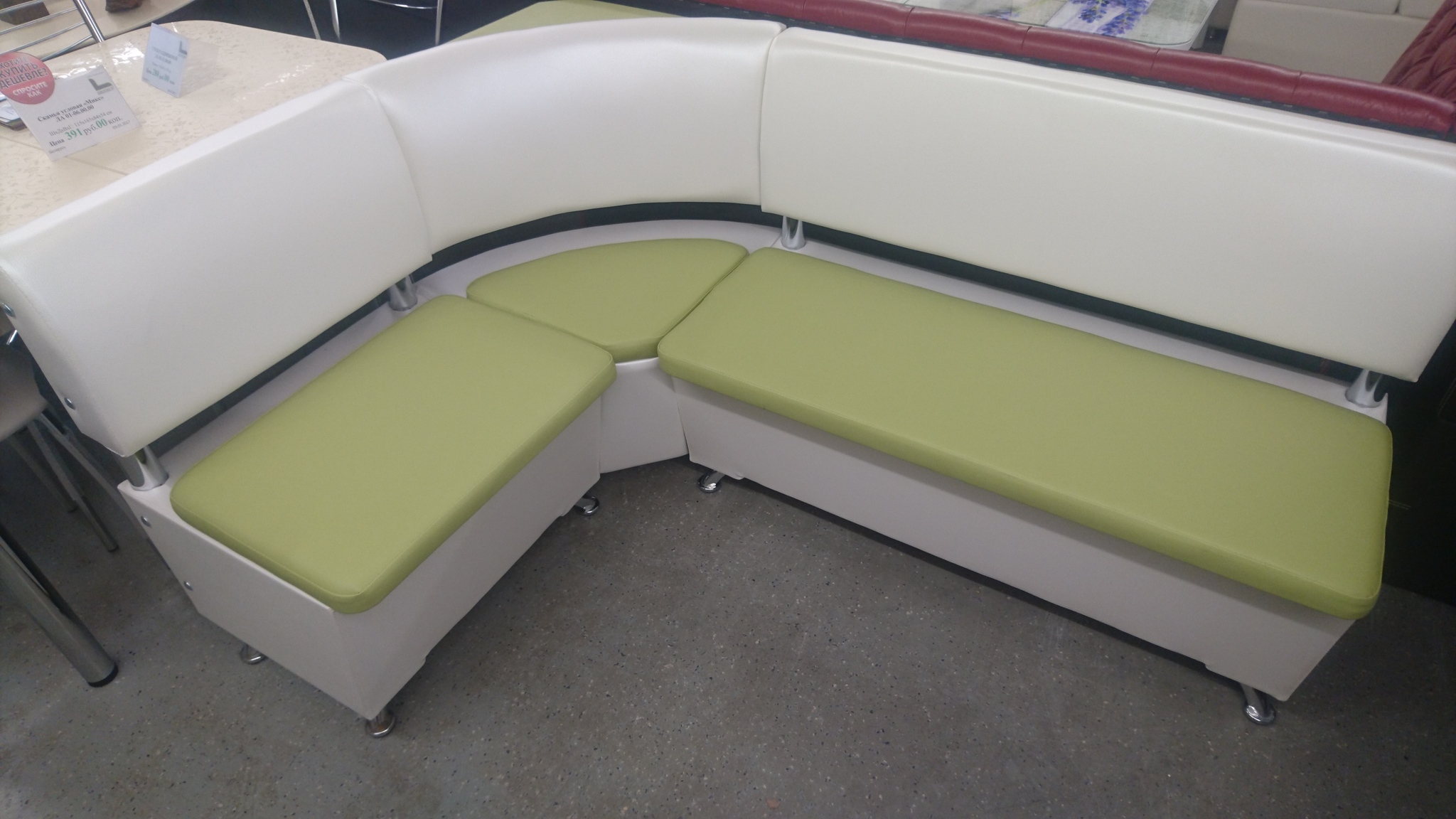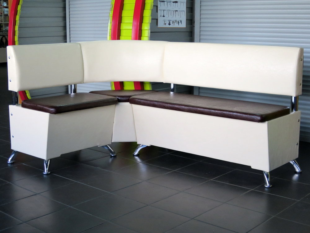 В набор входит: угловая скамья, стол, два табурета. Обивка: экокожа