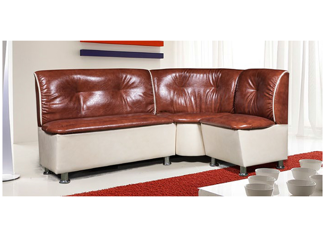 Сидение и спинка имеют невероятно мягкое основание и наполнитель, которые гарантируют очень удобное расположением на них, за счет чего данный угловой кухонный диван может стать самым любимым местом для отдыха. В качестве обивки используется качественная и прочная экокожа приятного коричневого цвета, декорированная светлым кантом и красивой объемной стяжкой. осование выполнено в серо-бежевом цвете.