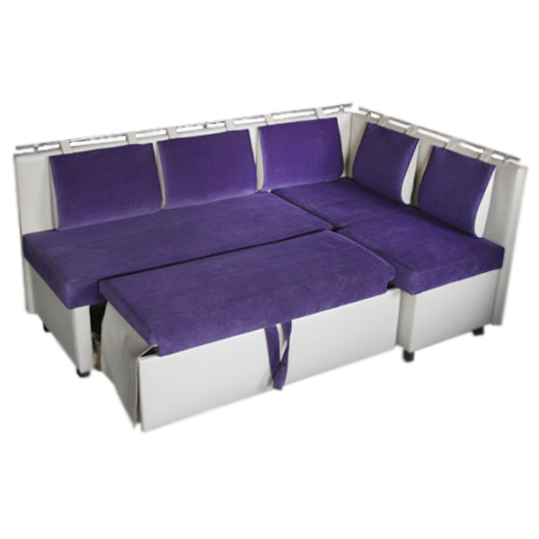 Угловая скамья «Фрегат-5» представлена в современном стиле. Удачное сочетание белого и фиолетового цветов позволяет скамье занять достойное место в вашем доме, став одной из центральных элементов обстановки. В роли мягкой спинки выступают удобные подушки небольших размеров. При помощи надежного механизма раскладки диван можно без труда превратить в комфортную кровать.