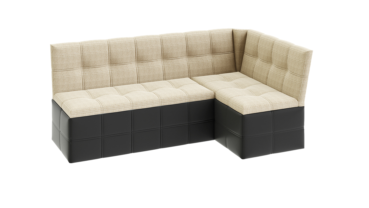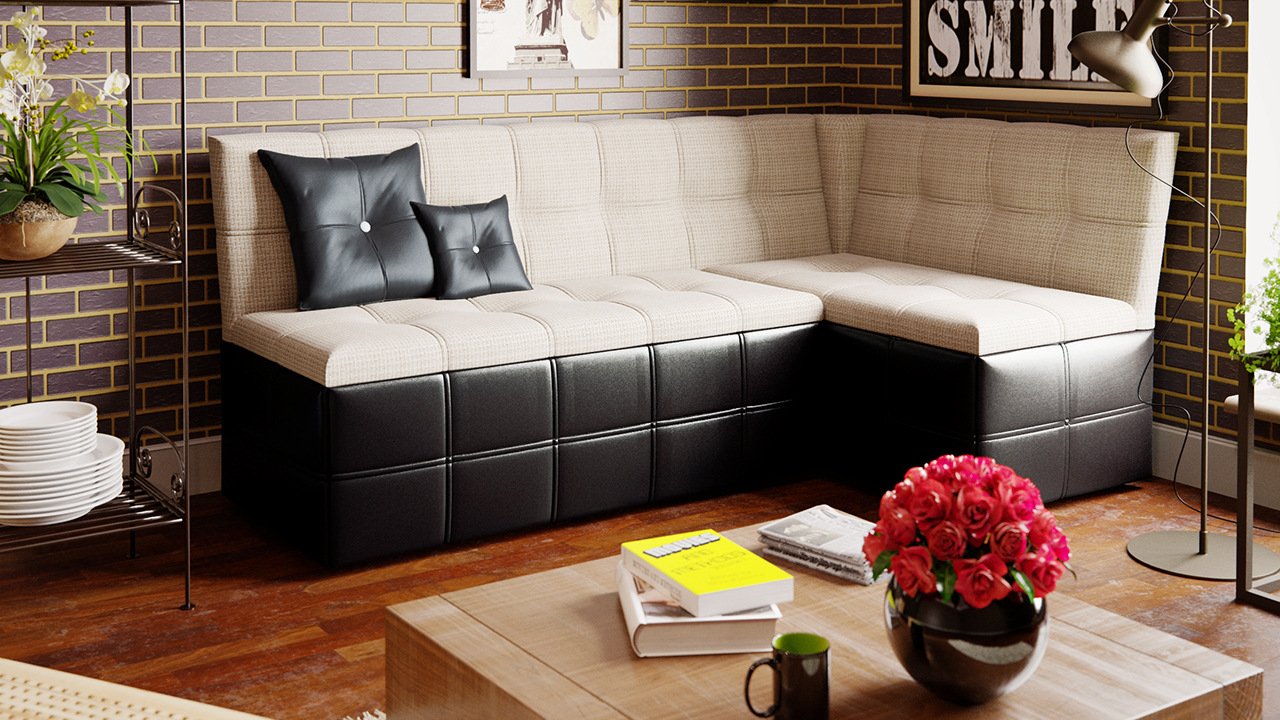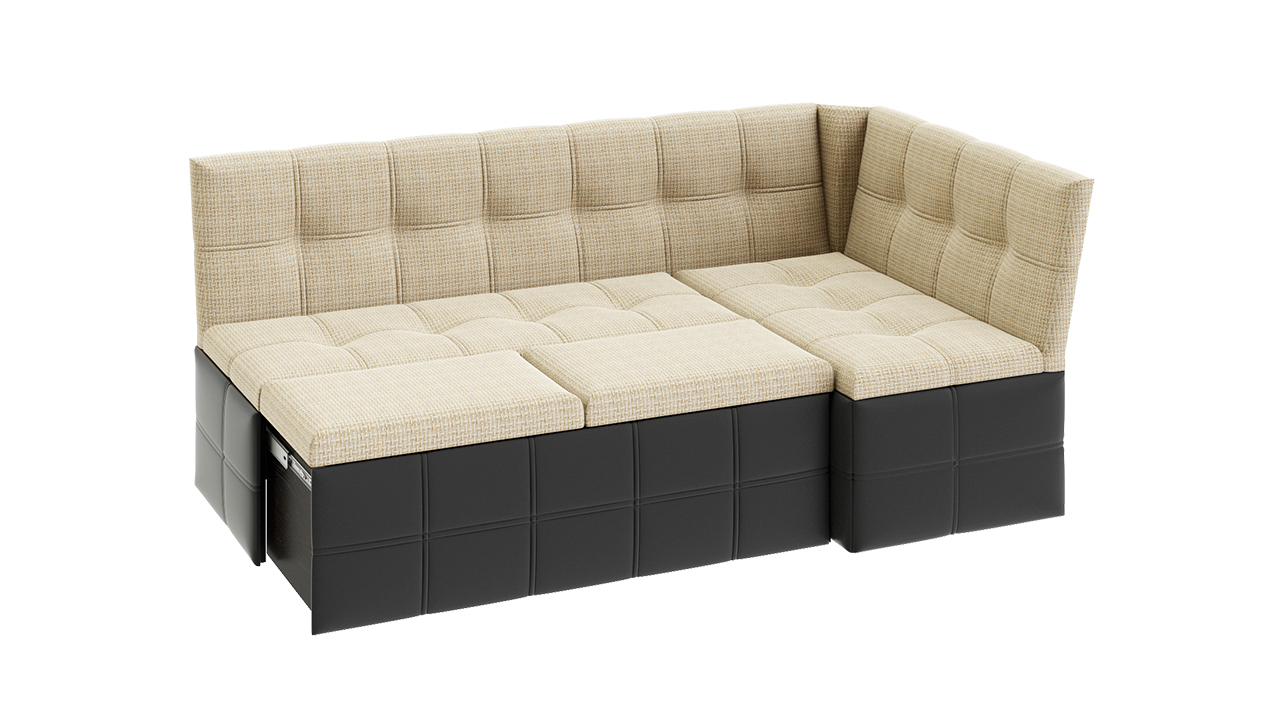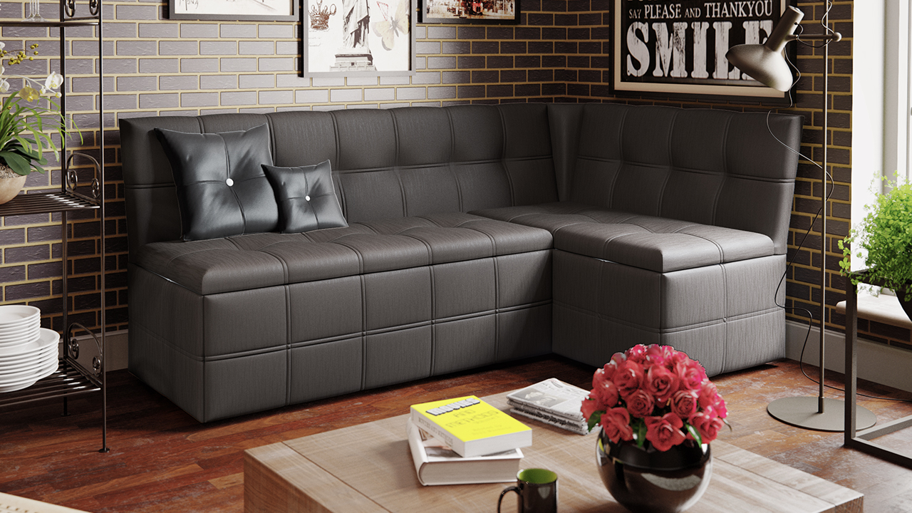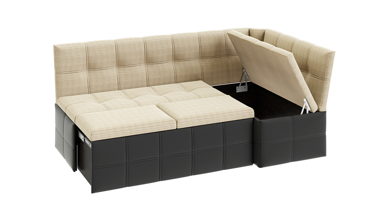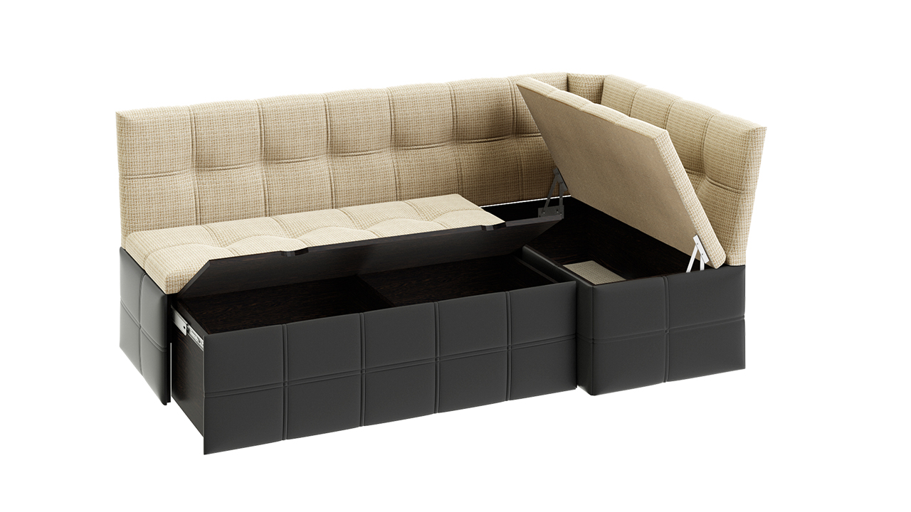 Состоит из углового кухонного дивана, обеденного стола и двух мягких табуретов. Под сиденьем находятся ящики для хранения. Универсальная сборка - право/лево.